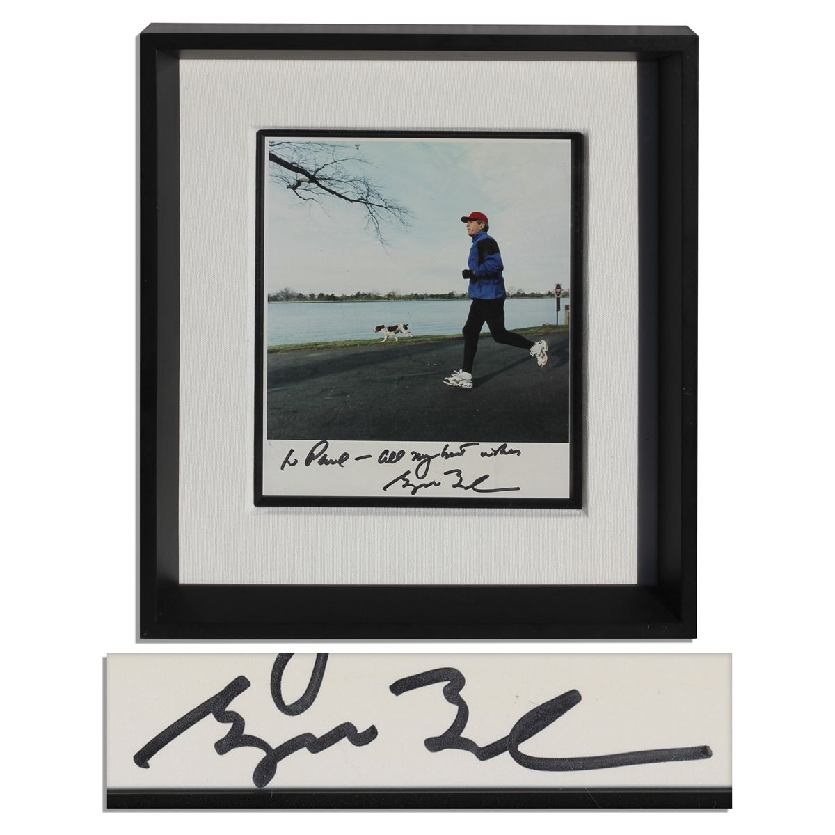 George W. Bush signed photo. Image of the President jogging with his Springer Spaniel named Spot is inscribed on the lower border in black felt tip, ''to Paul - all my best wishes / George Bush''. Photo measures 8'' x 10''. Framed behind recessed glass to an overall size of 13.5'' x 15''. Near fine.