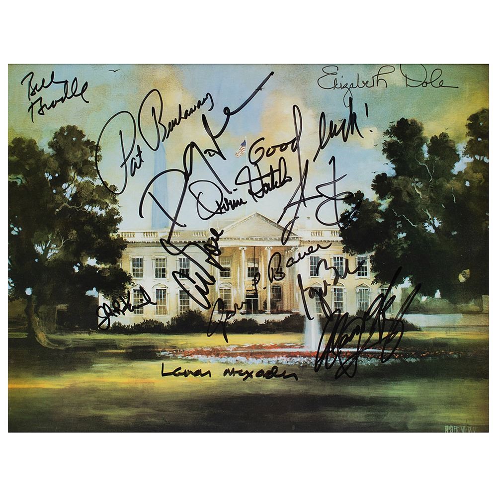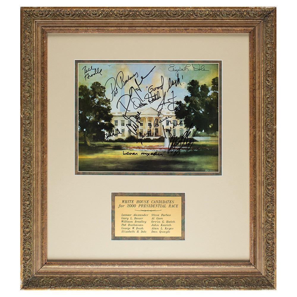Impressive color 10.5 x 8.25 cardstock photo of a painting of the White House, signed in black felt tip by twelve of candidates for the 2000 presidential election, including: George W. Bush, Al Gore, Lamar Alexander, Gary L. Bauer, William Bradley, Pat Buchanan, Elizabeth Dole, Steve Forbes, Orrin G. Hatch, John Kasich, Alan Keyes, and Dan Quayles. Double-matted and framed with an engraved plaque to an overall size of 19 x 21. In fine condition. A scarce combination of signatures from the hotly contested election, the result of which was ultimately decided by the Supreme Court in the famous Bush v. Gore case.