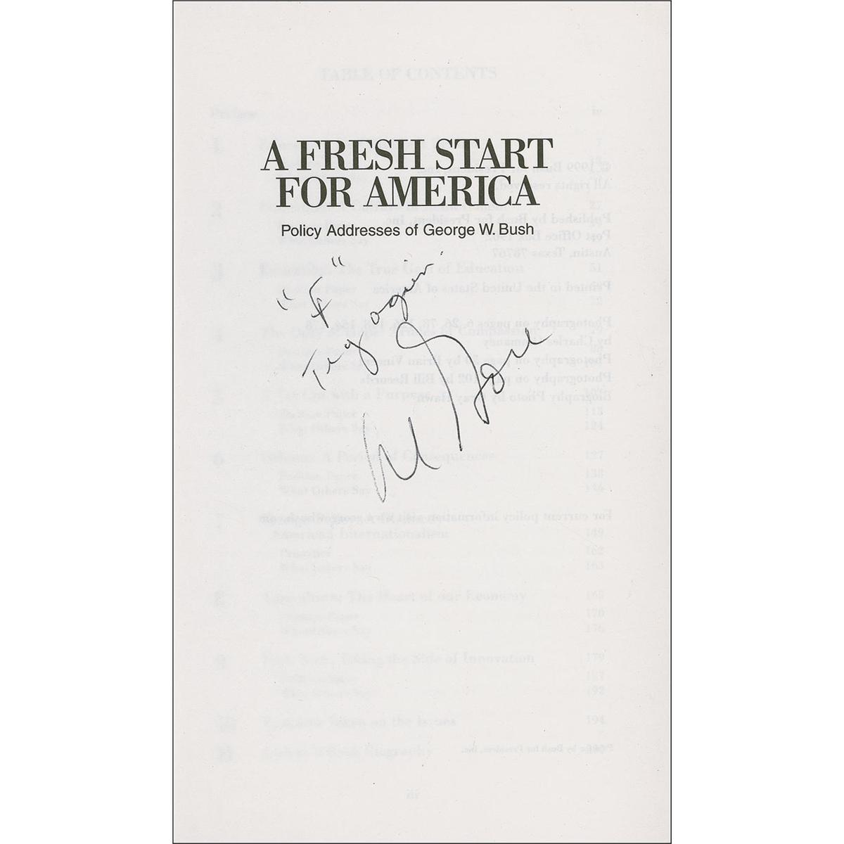 Signed book: A Fresh Start for America. Texas: Bush for President Inc., 1999. Softcover, 5.25 x 8.5, 208 pages. Signed on the front cover in black felt tip, “Best wishes, George W. Bush,” and on the title page, “’F’ Try again. Al Gore.” Some light creasing and wear to both covers, and mild handling wear, otherwise fine condition. Accompanied by two photos taken at time of signing.