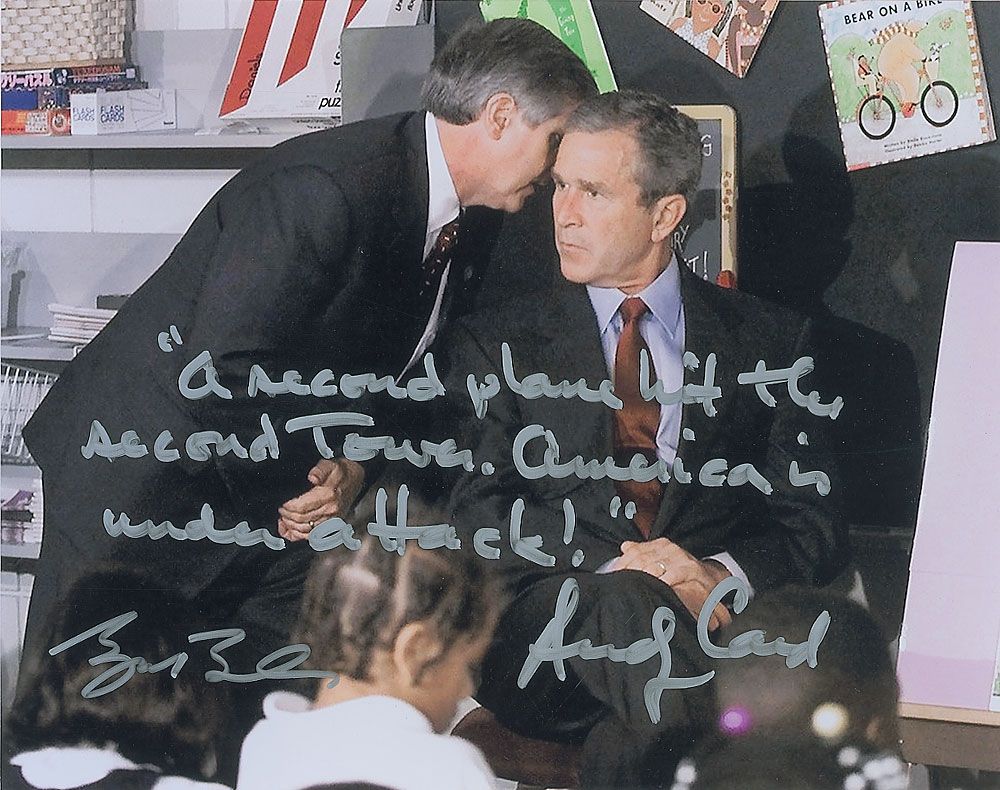 Color glossy 10 x 8 photo of Card speaking to President Bush on the morning of 9/11, signed in silver ink, “‘A second plane hit the second Tower. America is under attack!’ Andy Card,” and “George W. Bush.” In fine condition. Consignor indicates that Card signed the photo at a 2001 White House Correspondents dinner and Bush signed on September 13, 2011, at the Hilton Hotel in Dallas, Texas.