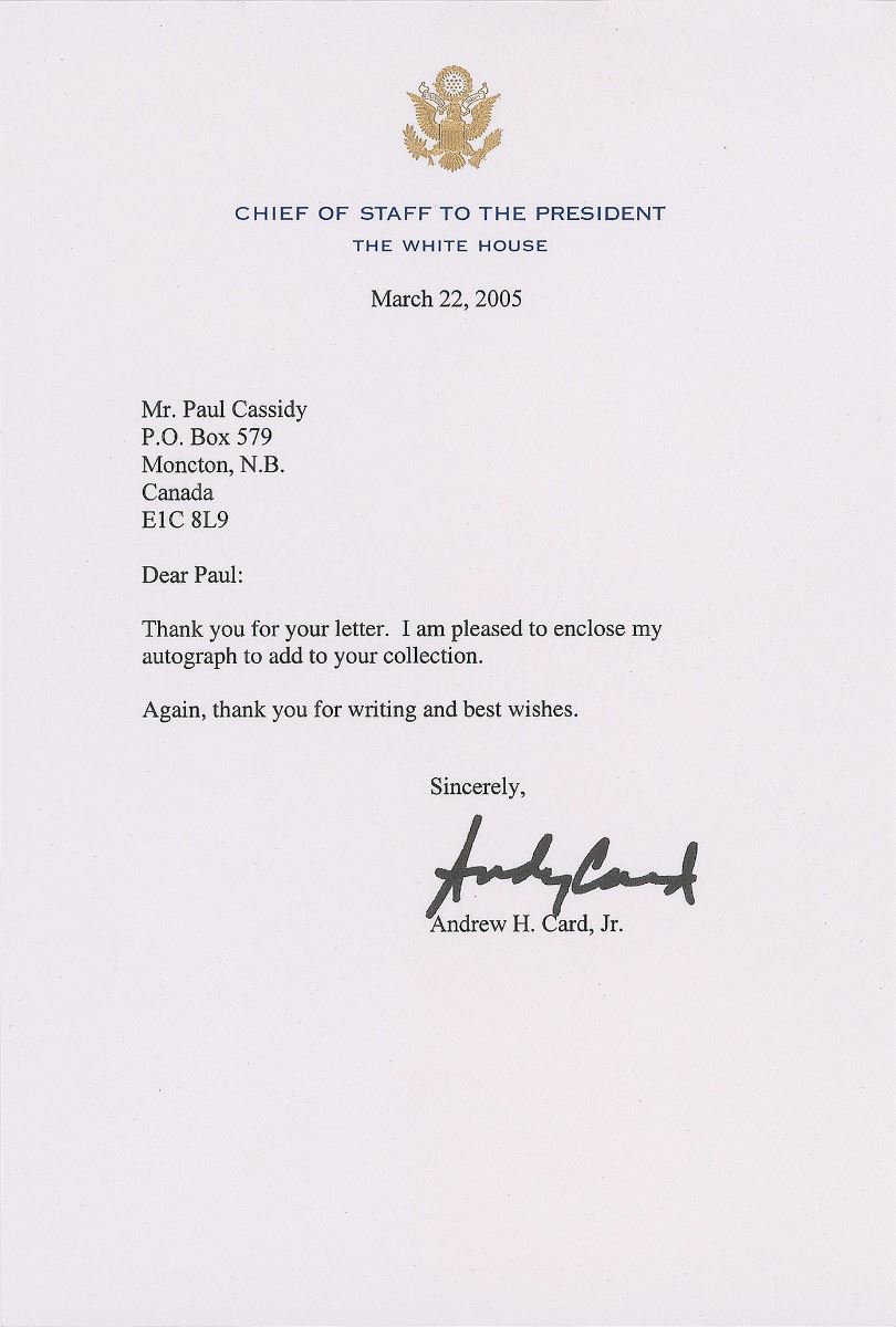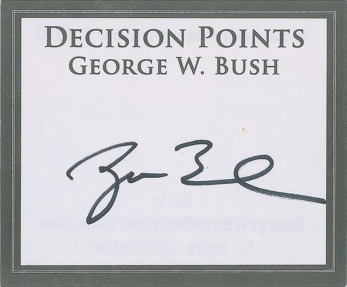 Two items: a Decision Points bookplate, 4.25 x 3.5, signed in black felt tip, “George W. Bush”; and a TLS signed “Andy Card,” one page, 6.25 x 9.25, Chief of Staff to the President letterhead, March 22, 2005. Letter to Paul Cassidy, in full: “Thank you for your letter. I am pleased to enclose my autograph to add to your collection. Again, thank you for writing and best wishes.” In overall fine condition.