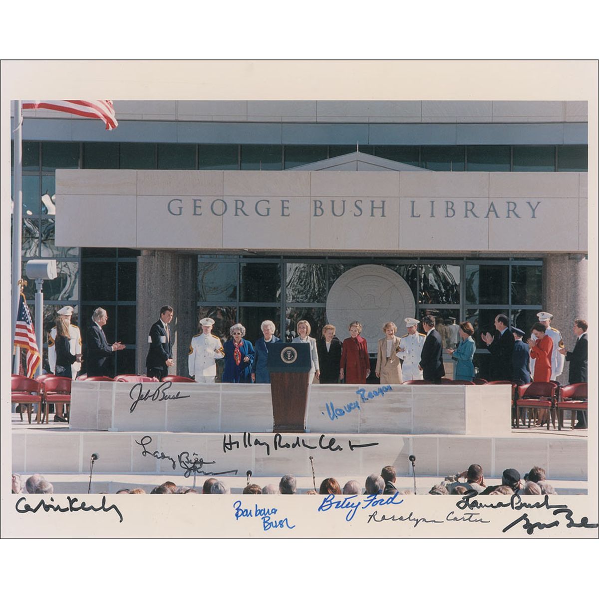 Color satin-finish 10 x 8 photo of the dedication of the George Bush Library, signed in blue and black felt tip by Lady Bird Johnson, Barbara Bush, Hillary Rodham Clinton, Betty Ford, Nancy Reagan, Rosalynn Carter, Laura Bush, George W. Bush, Jeb Bush, and Caroline Kennedy. In fine condition. An impressive collection of seven First Ladies on a single item.