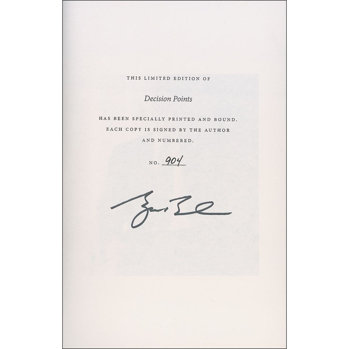 Signed book: Decision Points. Limited edition first edition, first printing (this being no. 904). NY: Crown Publishers, 2010. Hardcover with slipcase, 6.5 x 9.5, 497 pages. Signed on the limitations page in black felt tip by Bush. In fine condition, with some light wear and rubbing to slipcase.