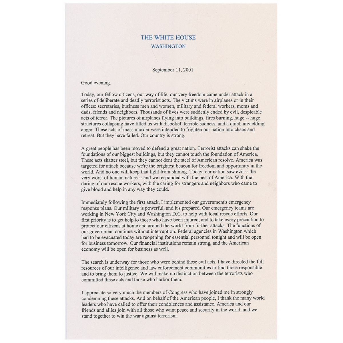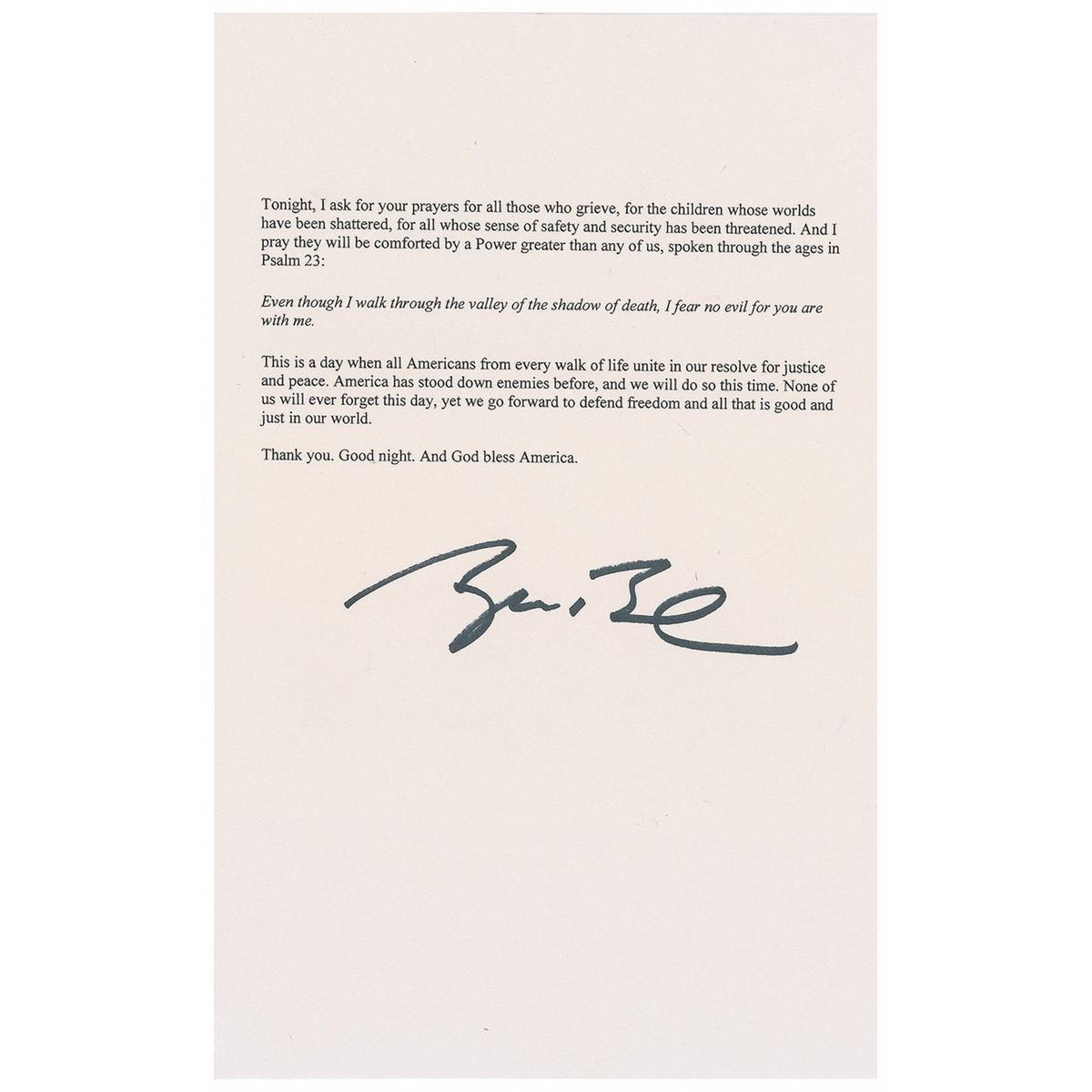 Souvenir typescript of Bush’s address to the nation on the night of September 11, 2001, on two 5.75 x 9.25 sheets of mock White House letterhead, signed at the conclusion in black felt tip. Address reads, in part: “Today, our fellow citizens, our way of life, our very freedom came under attack in a series of deliberate and deadly terrorist acts…A great people has been moved to defend a great nation. Terrorist attacks can shake the foundations of our biggest buildings, but they cannot touch the foundation of America.” In fine condition. An exceptional offering from one of Bush’s most important national addresses.