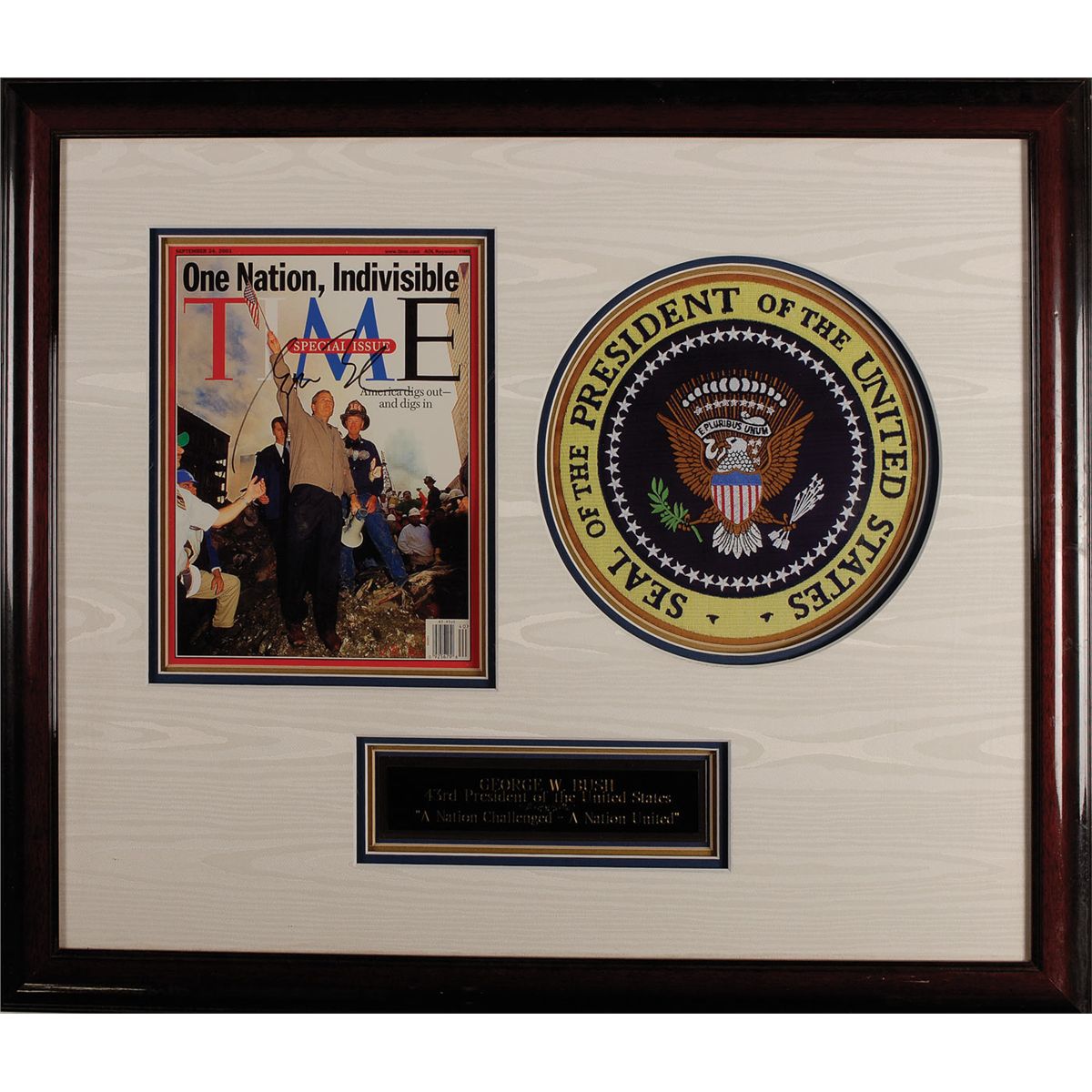 Time magazine, dated September 24, 2001, showing Bush at Ground Zero, signed in black felt tip. Triple matted and framed, with a small plaque and a large presidential seal, to an overall size of 27 x 23. Oversized.
