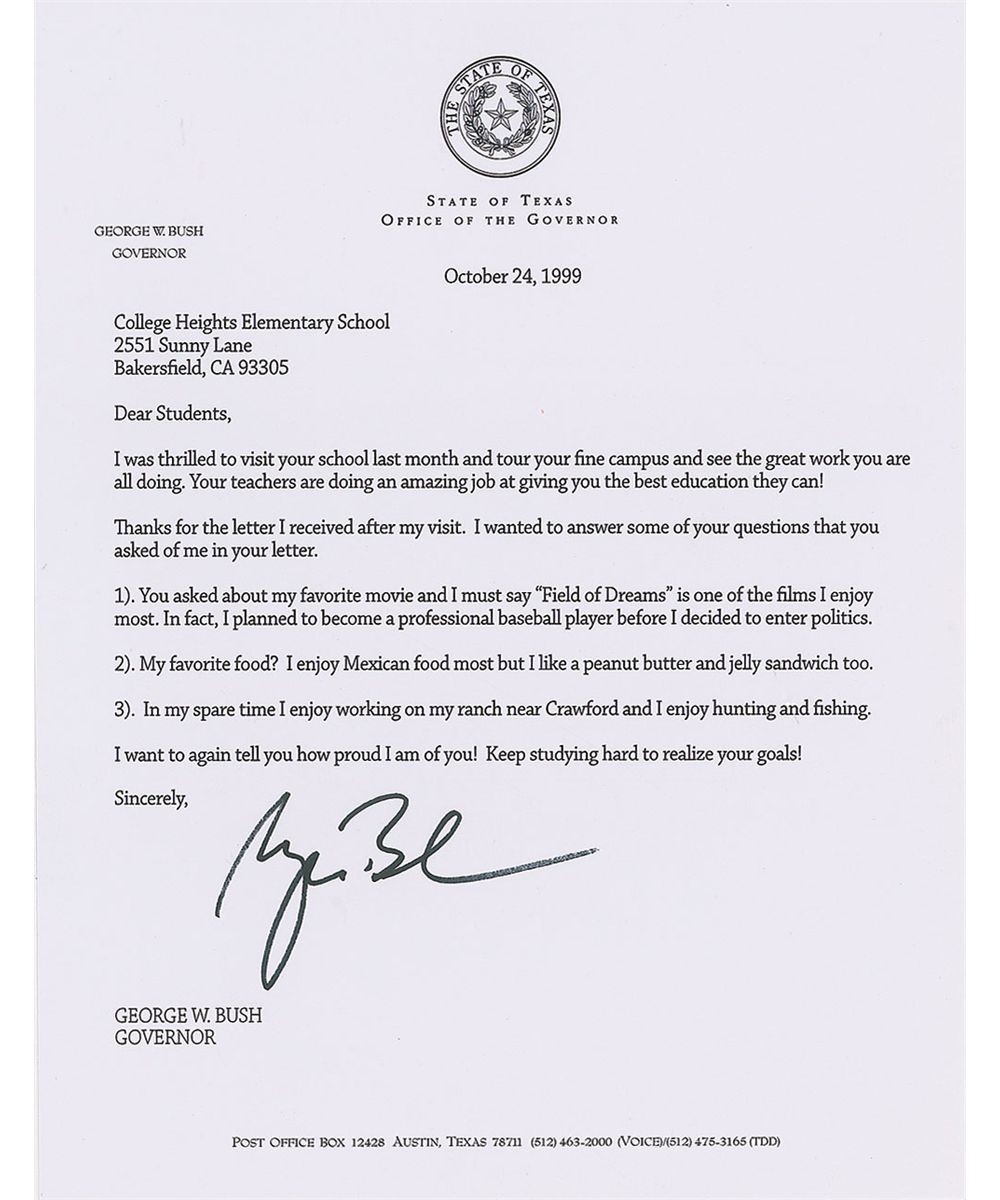 TLS, one page, 8.5 x 11, State of Texas letterhead, October 24, 1999. Letter to the students of the College Heights Elementary School. In part: “Thanks for the letter I received after my visit. I wanted to answer some of your questions that you asked of me in your letter. 1). You asked me about my favorite movie and I must say ‘Field of Dreams’ is one of the films I enjoy most. In fact, I planned to become a professional baseball player before I decided to enter politics. 2). My favorite food? I enjoy Mexican food most but I like a peanut butter and jelly sandwich too. 3). In my spare time I enjoy working on my ranch near Crawford and I enjoy hunting and fishing.” In fine condition.