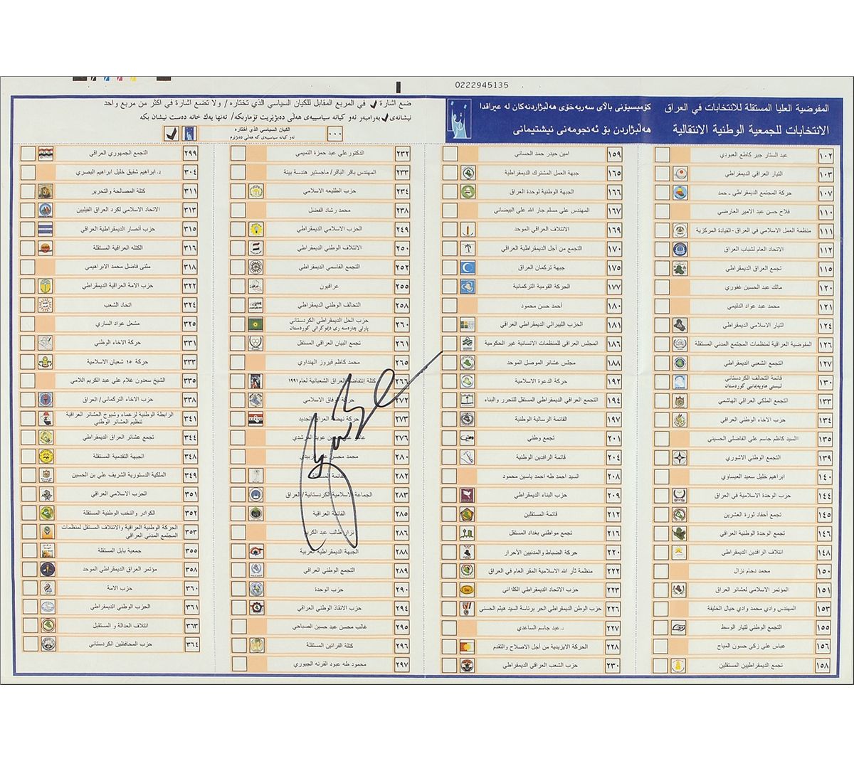 Vibrant DS, one page, 23 x 16.5. Historically significant January 30, 2005 Iraqi unused election ballot bearing 112 printed names in Arabic along with printed instructions at the top of the page and (translated) “The Independent Electoral Commission of Iraq. The Iraqi National Election.” Boldly signed in black felt tip, “George W. Bush,” along the second panel. In fine condition, with folds as issued and the end of Bush’s signature crossing two of the folds. The election was that nation’s first as a ‘free’ country. The consignor notes that the ballot was signed by the former president at a 2010 book-signing in Texas. An incredible piece of history linking the Bush administration with Middle Eastern politics.
