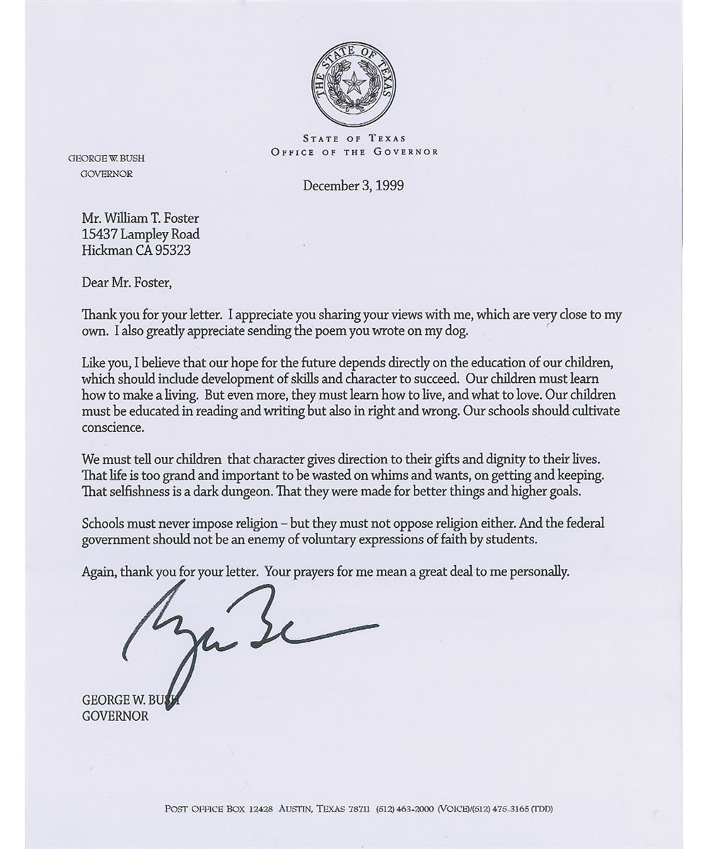 TLS, one page, 8.5 x 11, State of Texas letterhead, December 3, 1999. Letter to a gentleman in California. In part: “Like you, I believe that our hope for the future depends directly on the education of our children, which should include development of skills and character to succeed. Our children must learn how to make a living…Our schools should cultivate conscience. We must tell our children that character gives direction to their gifts and dignity to their lives…That they were made for better things and higher goals. Schools must never impose religion—but they must not oppose religion either. And the federal government should not be an enemy of voluntary expressions of faith by students.” In fine condition. During his campaign for president, Bush walked a delicate line regarding prayer in schools, supporting student-led prayer and the freedom to exercise their faith.