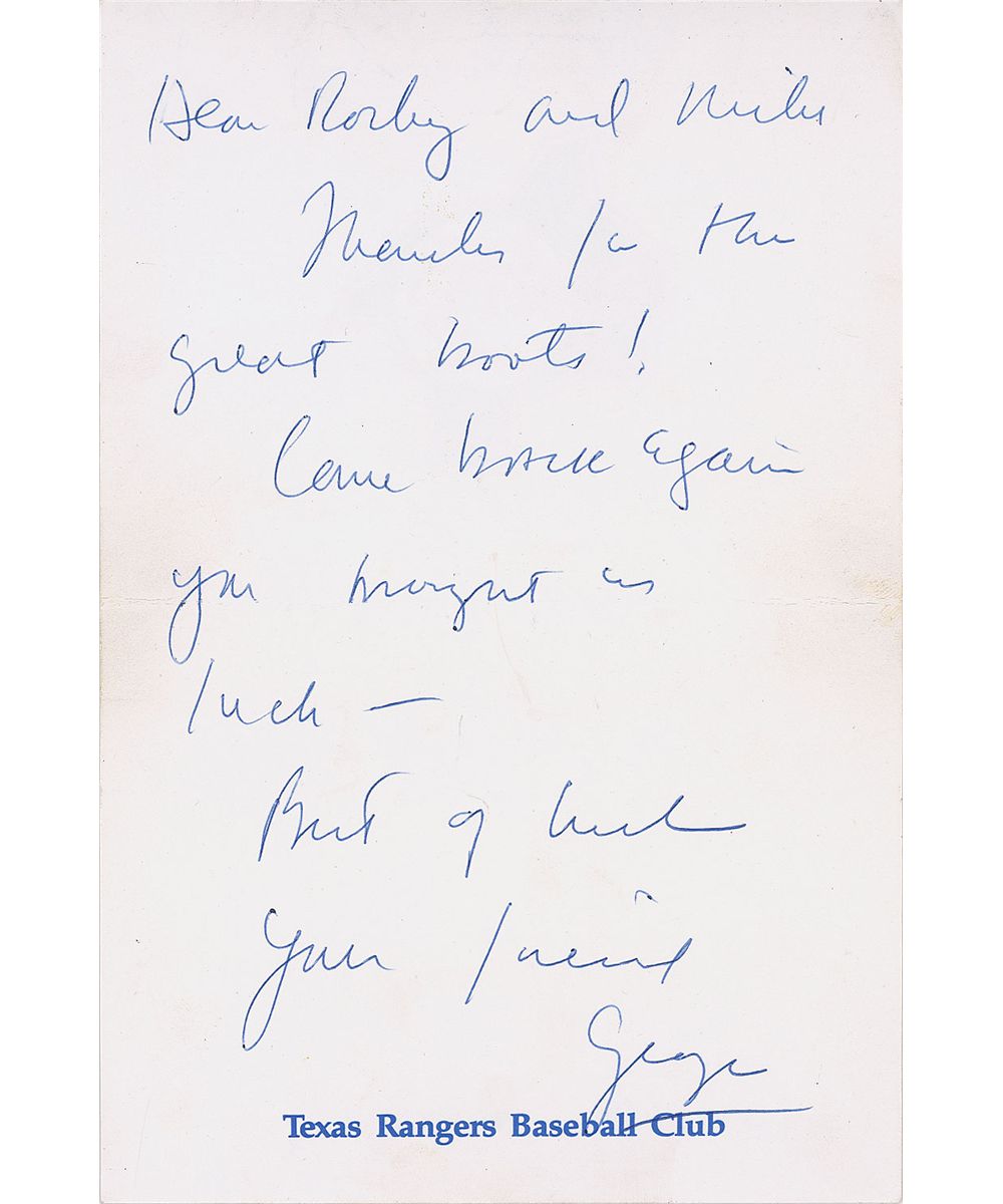 ALS signed “George,” on the inside of a 5.5 x 8 Texas Rangers Baseball Club card, no date. Letter of thanks for a gift. In full: “Thanks for the great boots! Come back again you brought us luck—Best of luck.” In fine condition, with a PSA/DNA authentication label affixed to reverse. Accompanied by a full letter of authenticity from PSA/DNA.