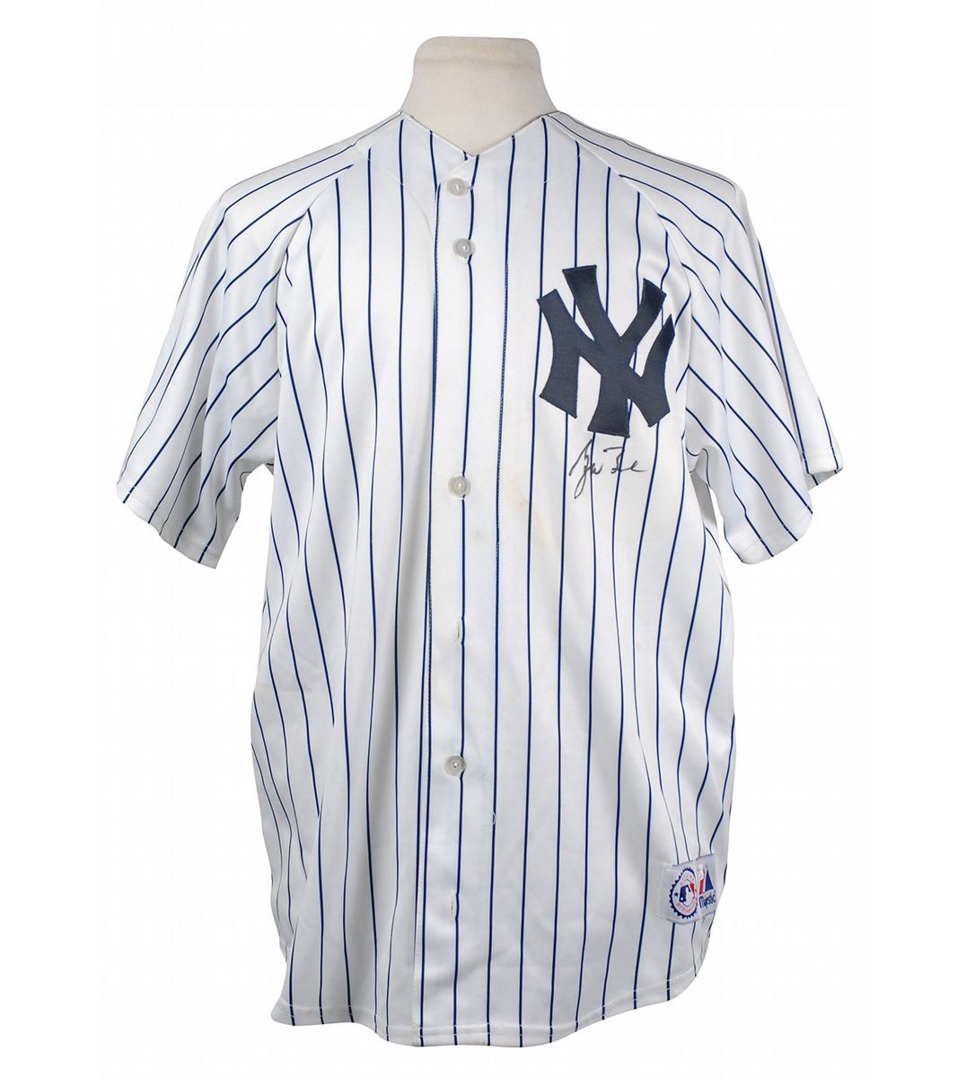 Official Majestic replica New York Yankees baseball jersey, with sewn on letters and numbers, signed in black felt tip on the front. In very good condition, with scattered soiling. Accompanied by two patches commemorating 9/11 and a full letter of authenticity from PSA/DNA.