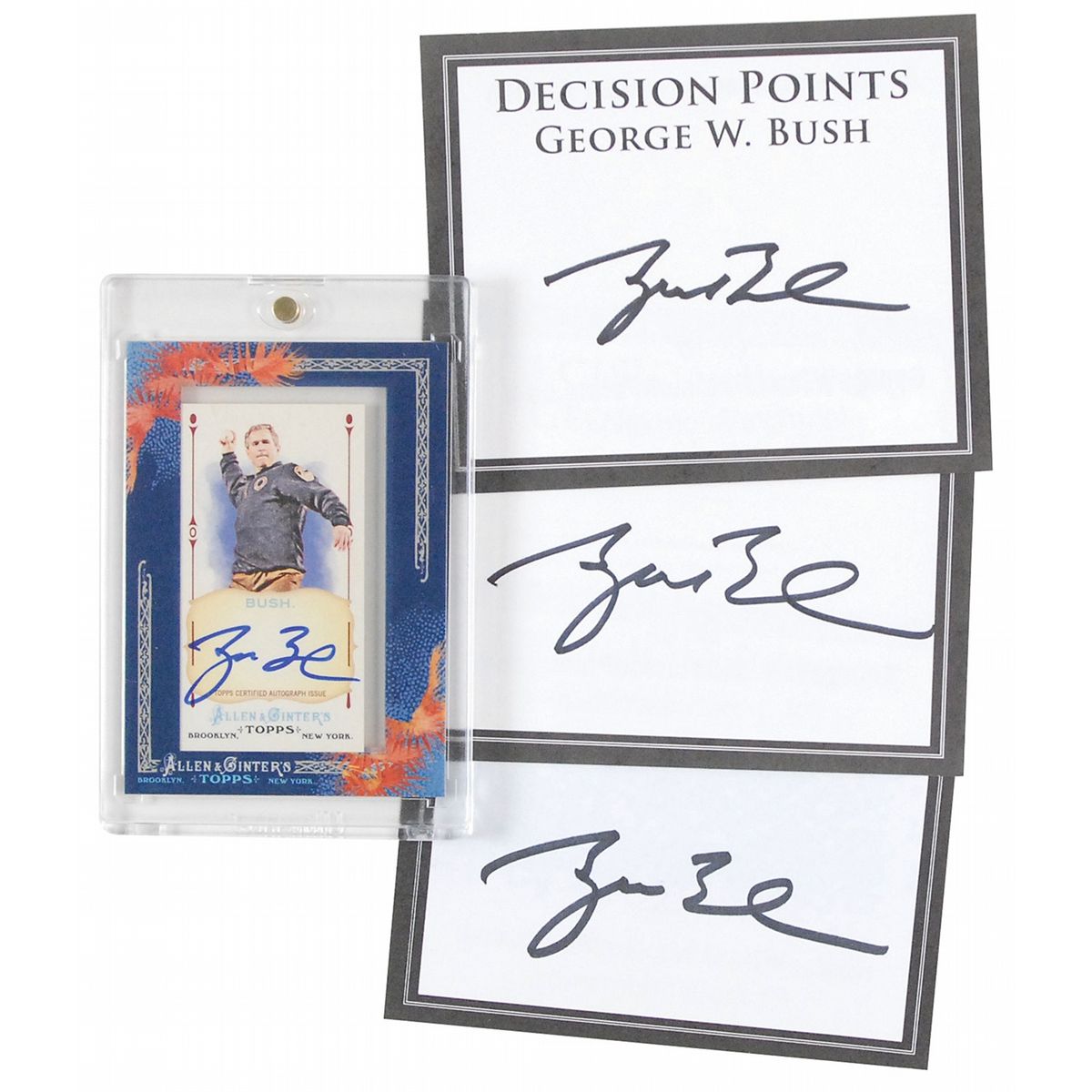 Four items: a 2011 Topps Allen & Ginter trading card from a limited edition of only 200 cards, signed in blue felt tip; and three Decision Points bookplates, each signed in black felt tip. In overall very fine condition. Accompanied by two original transmittal cards for the bookplates.