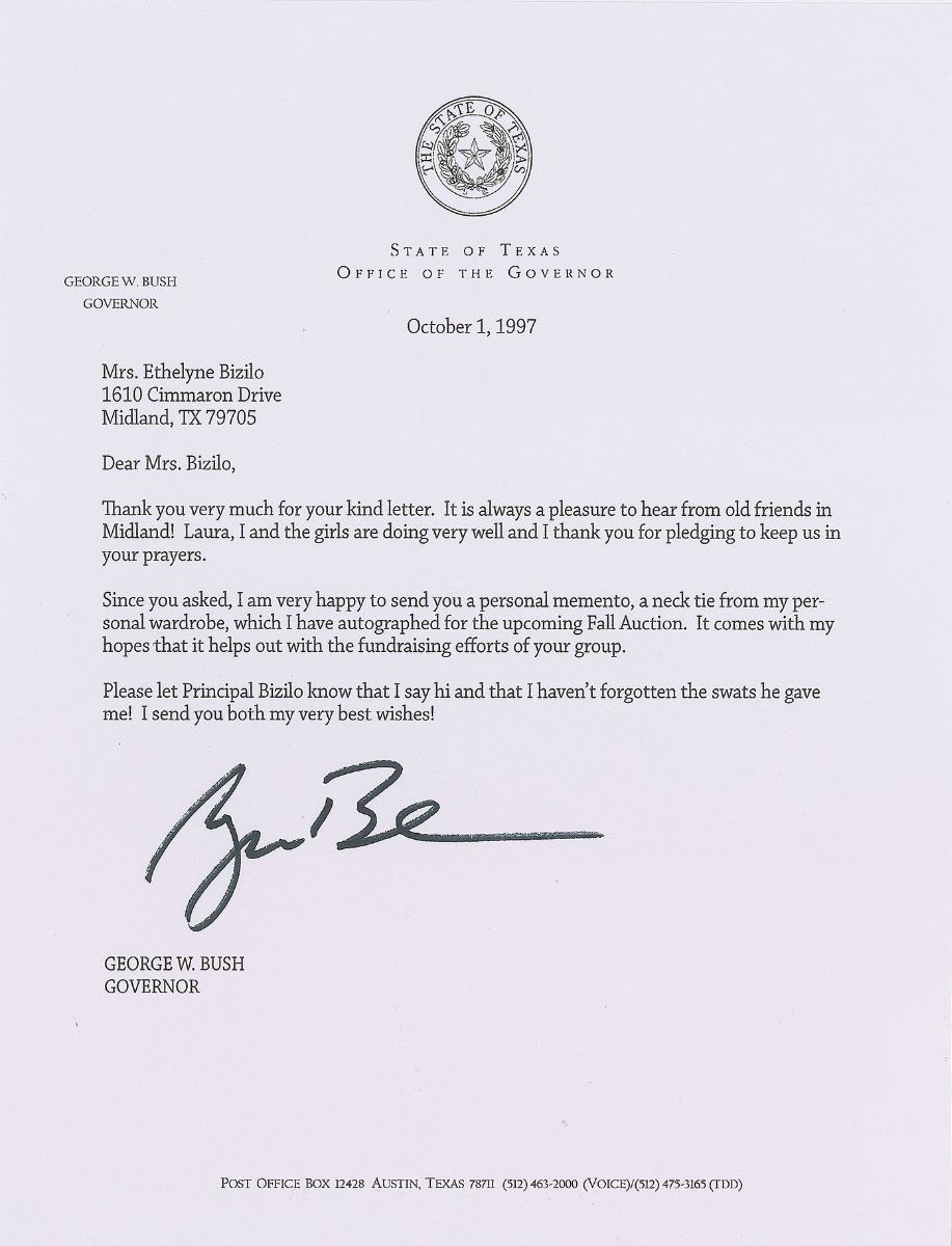 Two items: a TLS, one page, 8.25 x 10.75, State of Texas, Office of the Governor letterhead, October 1, 1997. Letter to Ethelyne Bizilo, in full: “Thank you very much for your kind letter. It is always a pleasure to hear from old friends in Midland! Laura, I and the girls are doing very well and I thank you for pledging to keep us in your prayers. Since you asked, I am very happy to send you a personal memento, a neck tie from my personal wardrobe, which I have autographed for the upcoming Fall Auction. It comes with my hopes that it helps out with the fundraising efforts of your group. Please let Principal Bizilo know that I say hi and that I haven’t forgotten the swats he gave me! I send you both my very best wishes!” Included is the referenced tie, a red-and-blue pattern Ted Lapidus necktie, signed on the tip lining in black felt tip. In overall fine condition.