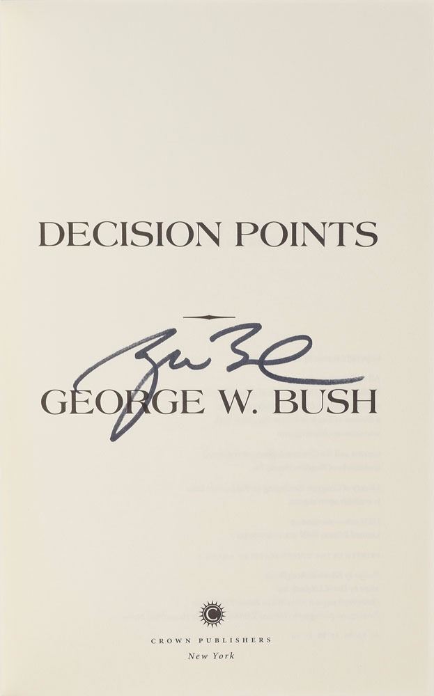 Signed book: Decision Points. Later printing. NY: Crown Publishers, 2010. Hardcover with dust jacket, 6.5 x 9.5, 497 pages. Signed on the title page in black felt tip by George W. Bush. In fine condition.