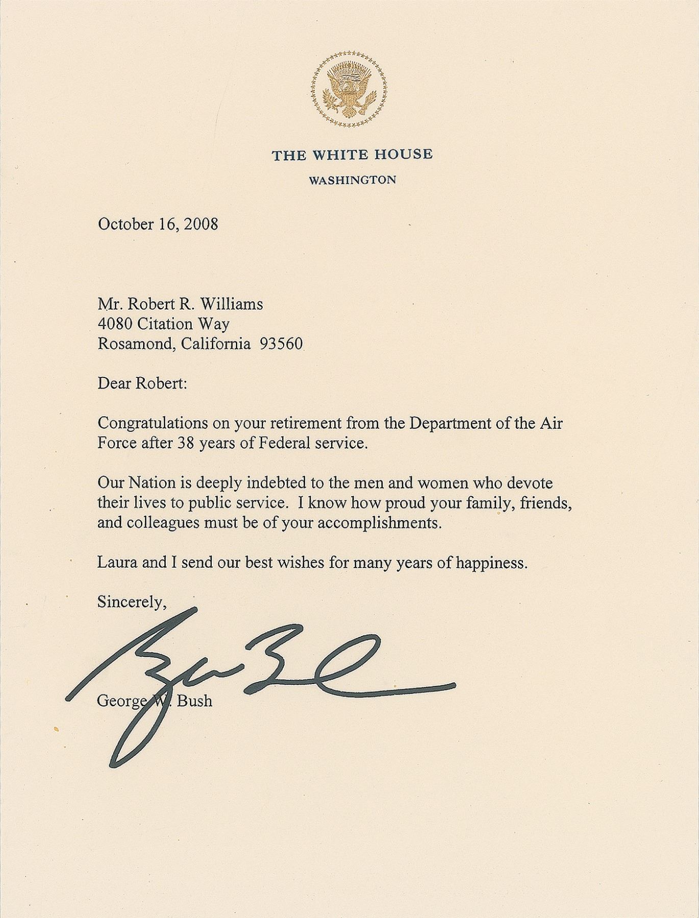 TLS as president, one page, 6.75 x 8.75, White House letterhead, October 16, 2008. Letter to Robert R. Williams, in full: "Congratulations on your retirement from the Department of the Air Force after 38 years of Federal service. Our Nation is deeply indebted to the men and women who devote their lives to public service. I know how proud your family, friends, and colleagues must be of your accomplishments. Laura and I send our best wishes for many years of happiness." In very fine condition.
