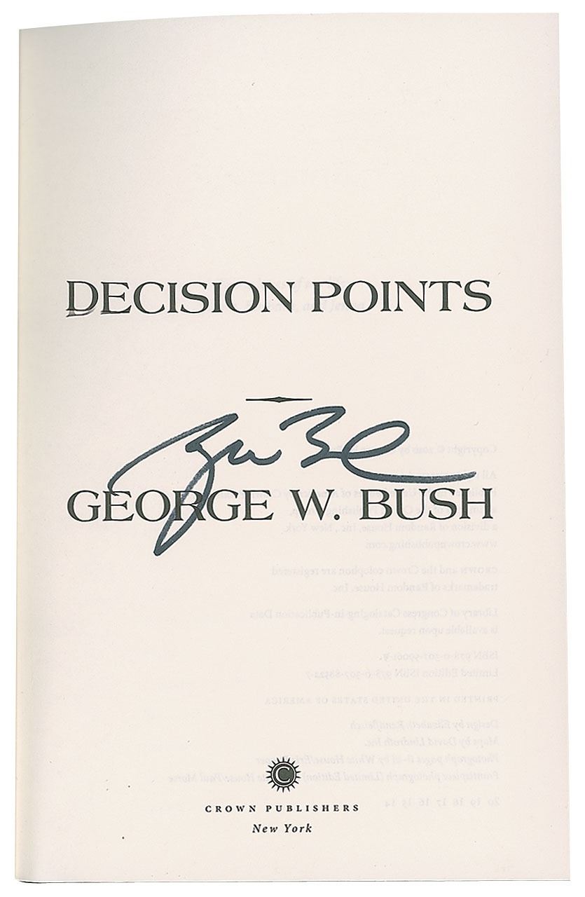Two books signed on an opening page in black felt tip by George W. Bush: a first edition of 41: A Portrait of My Father, hardcover with dust jacket; and a later printing of Decision Points, hardcover with dust jacket. In overall fine to very fine condition.