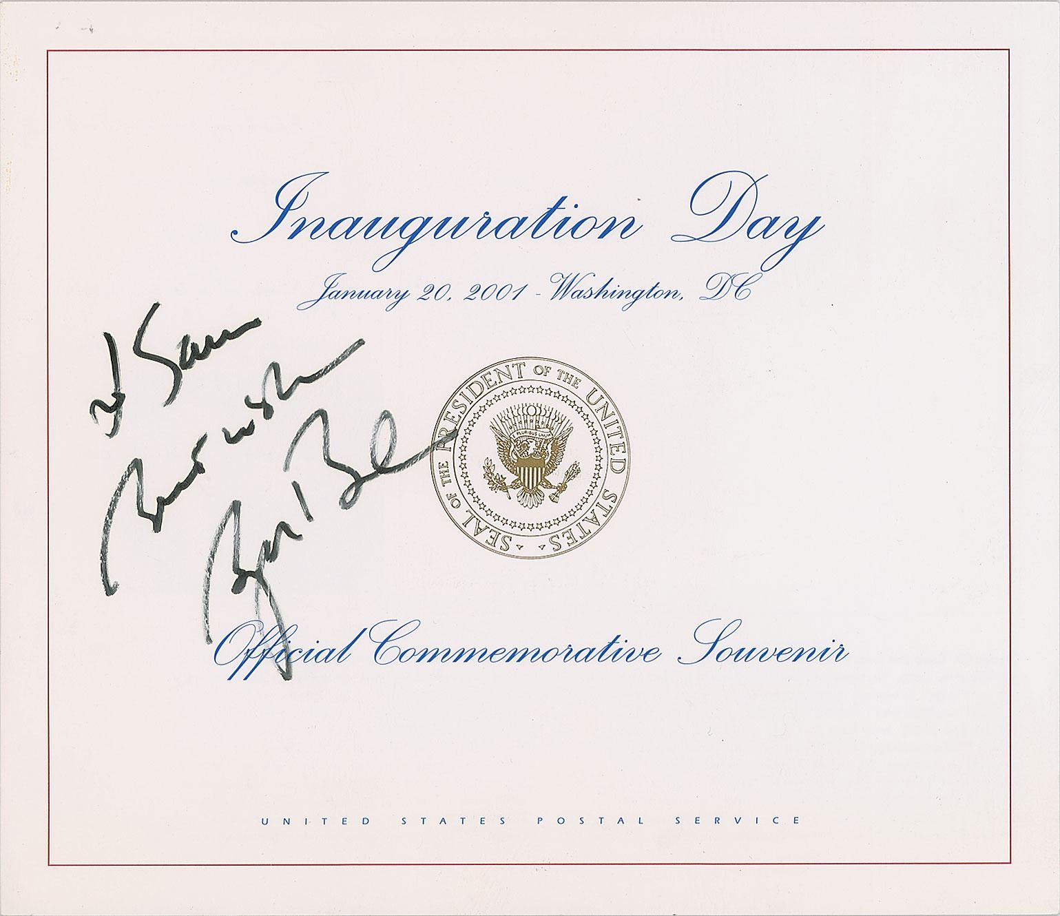 Commemorative souvenir folder from Inauguration Day, January 20, 2001, 11 x 9.5, containing a stamp sheet and postal cover, signed and inscribed on the front cover in black felt tip, "To Sam, Best wishes, George W. Bush." In fine condition. Consignor notes that this originates from the collection of Samuel Sutton, who was President Obama's personal valet, and who worked in such capacity in the White House in both the Obama and Bush administrations.
