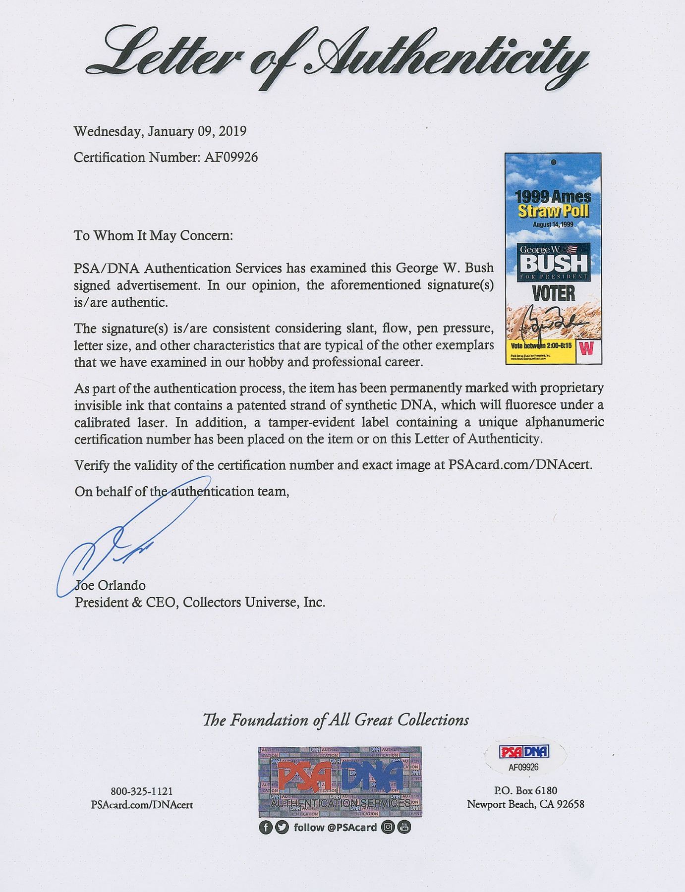 Voter ticket for the Ames Straw Poll held on the campus of Iowa State University on August 14, 1999, 3.5 x 8, stamped "W" in the lower right corner and signed in black felt tip by George W. Bush. Also included is a location and schedule card, a $25 Ames Straw Poll voucher, and a blue lanyard cord from the event. In fine condition. Texas Governor George W. Bush took a major first step toward becoming the 2000 GOP presidential nominee when he won the Iowa Republican straw poll with a total of 7,418 votes, easily outdistancing second and third-place nominees publisher Steve Forbes and former Red Cross Chairwoman Elizabeth Dole. Accompanied by a full letter of authenticity from PSA/DNA.