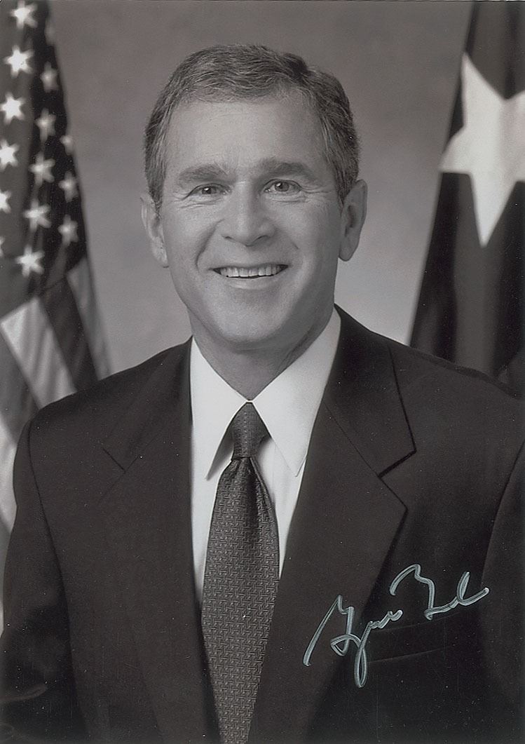Satin-finish 5 x 7 photo of George W. Bush as the Governor of Texas, signed in silver ink. Typed notation on reverse dates the signature to Austin in 1999. In fine condition.
