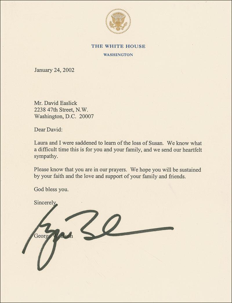 Uncommon TLS as president, one page, 6.75 x 9, White House letterhead, January 24, 2002. Letter of condolence to David Easlick, Jr. Easlick spent 25 years as the Executive Director of Delta Kappa Epsilon, a fraternity founded at Yale in 1844. Five presidents have been members of DKE, including Bush. In full: “Laura and I were saddened to learn of the loss of Susan. We know what a difficult time this is for you and your family, and we send our heartfelt sympathy. Please know that you are in our prayers. We hope you will be sustained by your faith and the love and support of your family and friends.” In fine condition. A very personal letter from the sitting president, who served as his chapter’s president during his senior year at Yale.