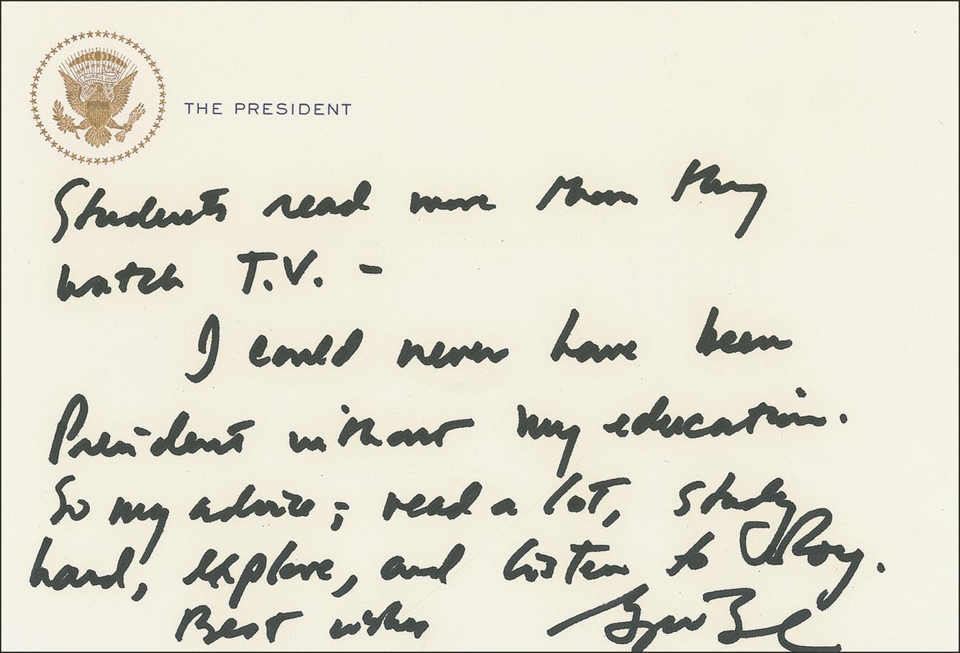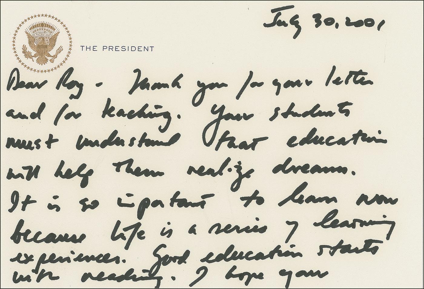 Rare ALS as president, two pages, 7.25 x 5, engraved “The President” letterhead, July 30, 2001. Letter written to a school teacher named Roy. In full: “Thank you for your letter and for teaching. Your students must understand that education will help them realize dreams. It is so important to learn now because life is a series of learning experiences. Good education starts with reading. I hope your Students read more than they watch T.V. I could never have been President without my education. So my advice: read a lot, study hard, explore, and listen to Roy.” In fine condition, with light haloing to all written text and signature. Handwritten letters from the 43rd chief executive are seldom encountered.