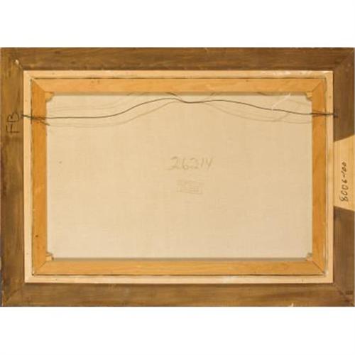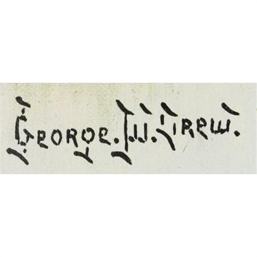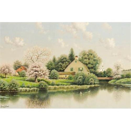 <B>GEORGE W. DREW (American, 1875-1968)</B></I><BR><I>Cottages on the Pond</B></I><BR>Oil on canvas<BR>24 x 36 inches (61.0 x 91.4 cm)<BR>Signed lower left: <I>George. W. Drew.</B></I><BR> <B>Condition Report:</B> Small puncture to canvas upper right, small indentation to canvas lower right.<BR><BR><b>Shipping:</b> Framed - without Glass, Large (<a target="_blank" href="http://www.heritageauctions.com/common/shipping.php">view shipping information</a>)