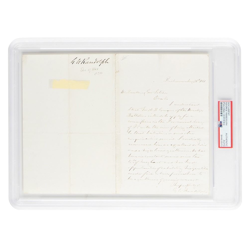 Civil War-dated ALS signed “G. W. Randolph,†one page, 5.25 x 8, August 26, 1861. Handwritten letter to Virginia Governor John Letcher, in part: “I understand that…A. B. Guigon of the Howitzer Battalion intends to apply for a commission of the Provisional Army of V’a with the view of being attached to that battalion or some other comparative service. I cordially recommend him as a gallant soldier and high toned gentleman.†Alexander B. Guigon (1831-1878) would go on to become a Captain of Virginia Artillery. In fine condition, with light toning along the left edge. Encapsulated in a PSA/DNA authentication holder.