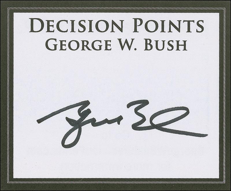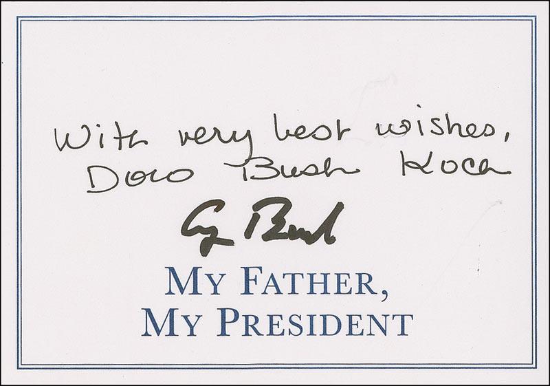 Two signed bookplates: a 4.25 x 3.75 bookplate for Decision Points, signed in black felt tip by George W. Bush; and a 5 x 3.5 bookplate for My Father, My President, inscribed in another hand, "With very best wishes, Doro Bush Koch," and signed in black felt tip by George Bush. In very fine condition.