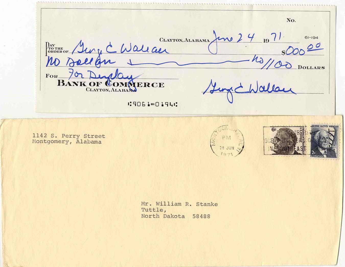 Handwritten check signed by Alabama Governor George Wallace, written to himself in 1971 and marked ''For Display''. Check measures 8.25'' x 3'' and is in near fine condition.
