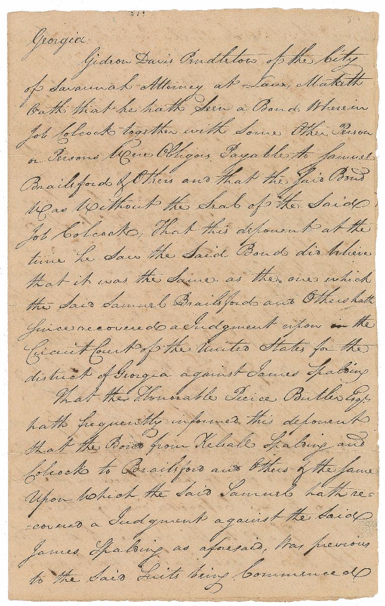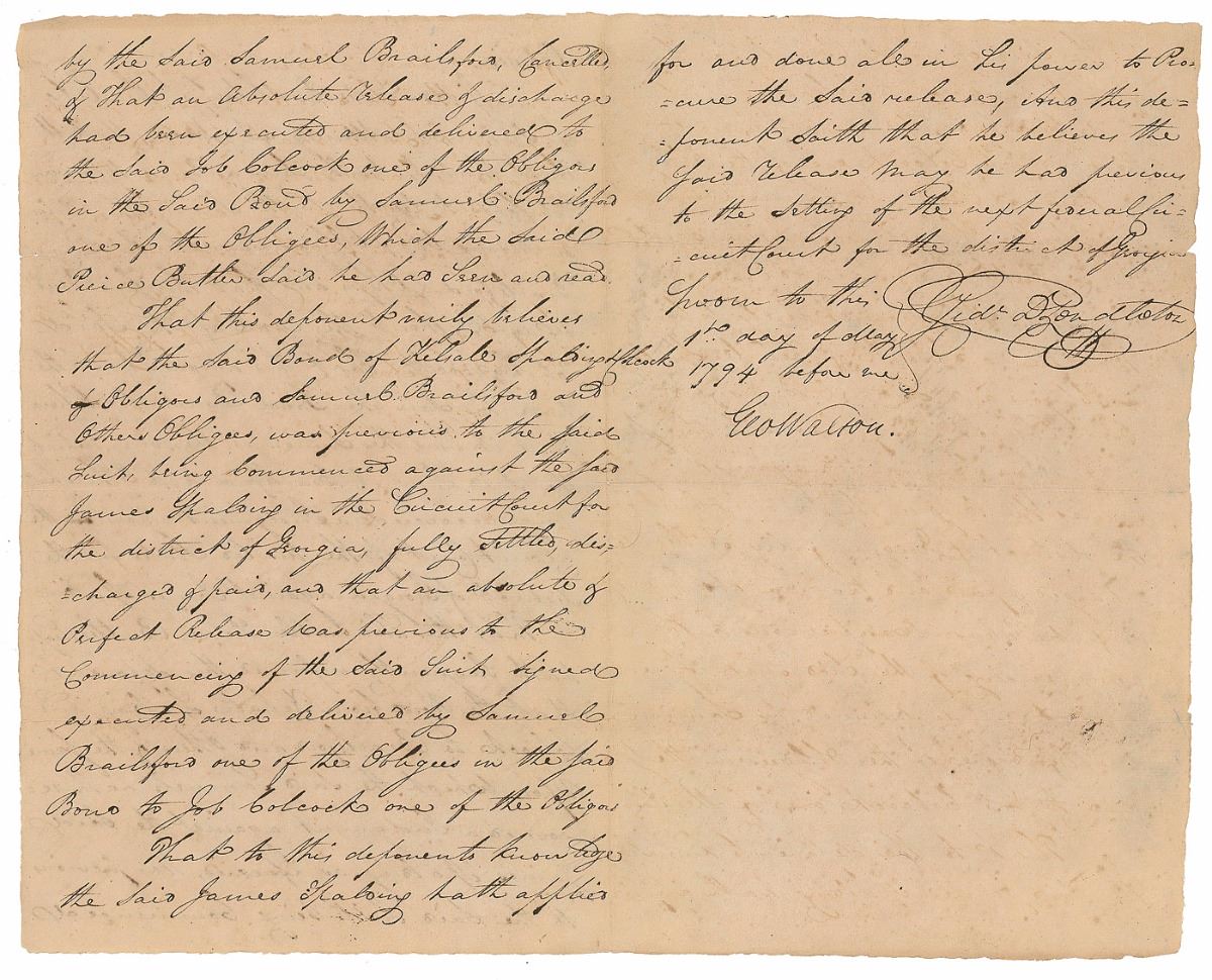 Manuscript DS, signed “Geo. Walton,” three pages on two adjoining sheets, 8.25 x 13, May 1, 1794. Lengthy legal document, in part: “Gideon Davis Pendleton of the City of Savannah Attorney at Law, Maketh Oath that he hath Seen a Bond Wherein Job Colcock together with Some Other Person or Persons Were Obligors Payable to Samuel Brailsford & Others and that the said Bond was without the Seal of the Said Job Colcock.” Crisply signed at the conclusion by Walton and Pendleton. In very good to fine condition, with splitting along horizontal folds and show-through from writing to opposing sides.