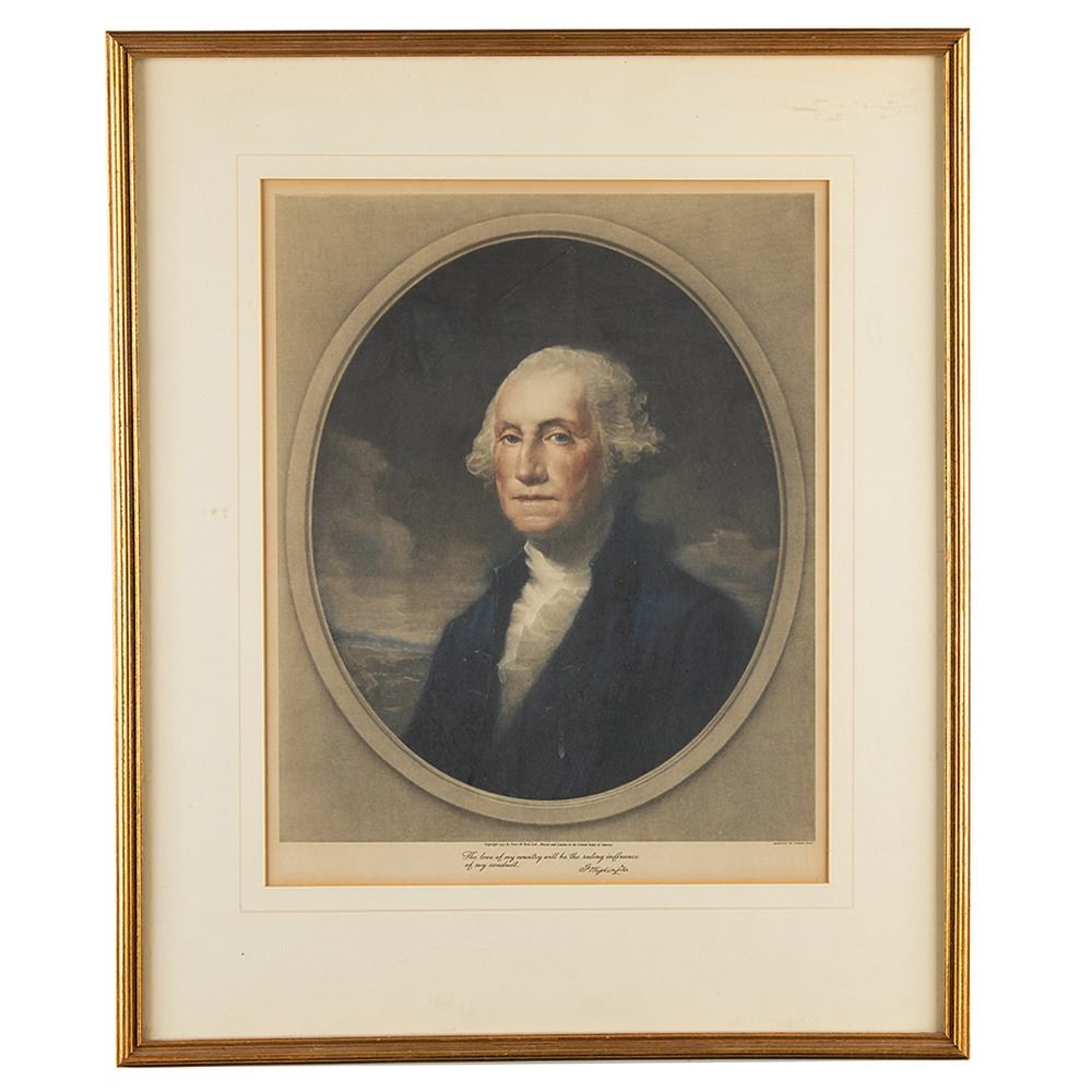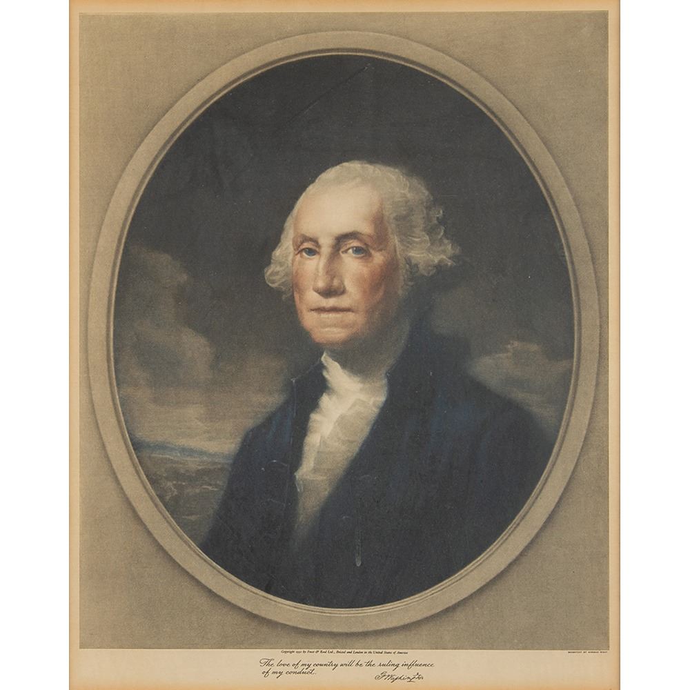 High-quality 11 x 13.75 mezzotint print of George Washington published in 1931 by Frost & Reed Ltd. of London, featuring an iconic portrait of the first president with a facsimile quote below: "The love of my country will be the ruling influence of my conduct, G. Washington." Matted and framed to an overall size of 16.75 x 20. In fine condition.