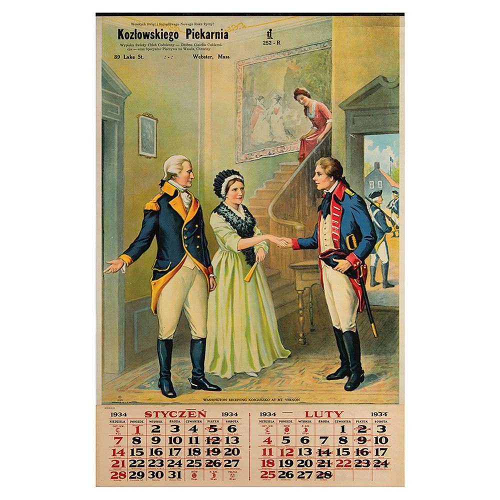 Polish and English-language color 15 x 23 salesman's sample (252 R) of a 1934 calendar entitled ‘Washington Receiving Kosciuszko at Mt. Vernon,’ featuring artwork of the Polish-Lithuanian military engineer meeting with George and Martha Washington at their home. In very good to fine condition, with scattered marks and creases.