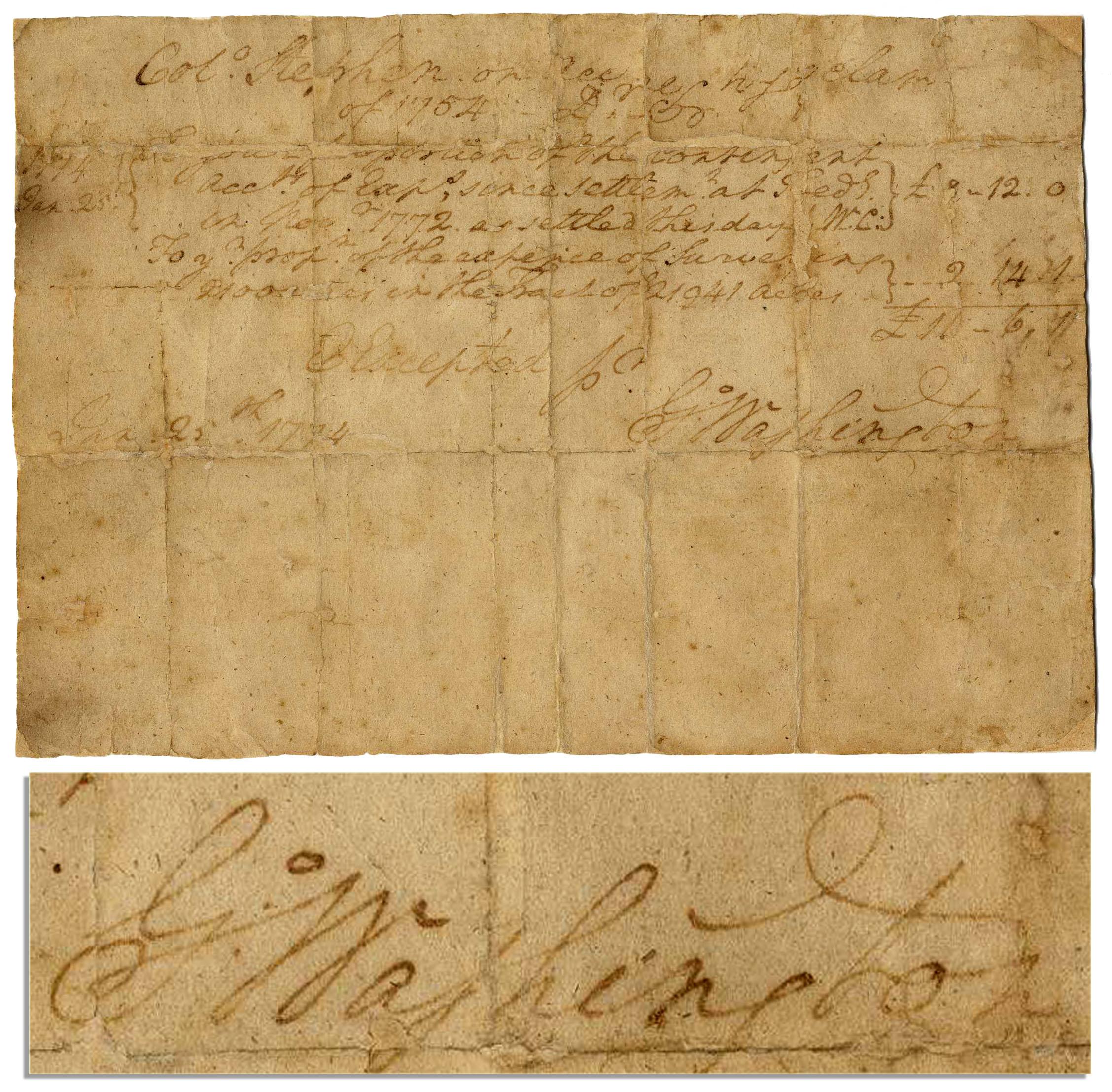 George Washington autograph document signed, dated 25 January 1774. Written entirely in Washington's hand, this somewhat enigmatic document appears to be an invoice for expenses associated with surveying lands some twenty years earlier on behalf of a ''Colo. Stephen'', possibly Adam Stephen, who served with Washington in the Virginia Militia during the French and Indian War. Stephen, like Washington, was an aggressive land speculator who often rivaled the future President in both politics and business. With a large, bold ''G Washington'' signature. Document measures 7.25'' x 5'' with archival repairs along numerous folds and moderate uniform toning. Writing contrasts somewhat light against the toned paper. Good condition.