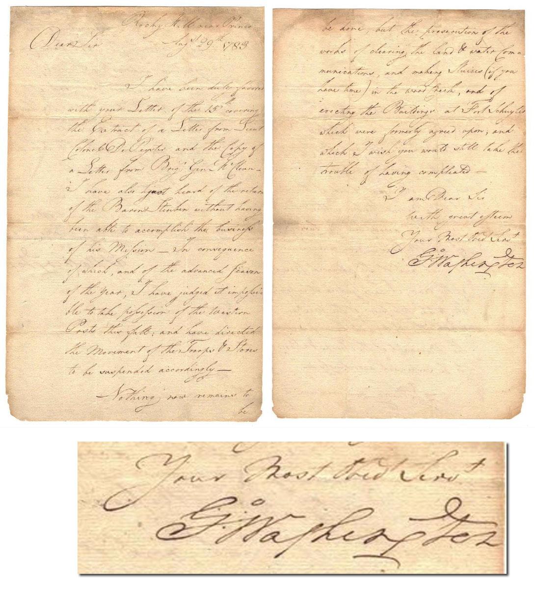 George Washington autograph letter signed as First Commander in Chief of the Continental Army, dated 29 August 1783, from Rocky Hill, Princeton. Written as the Articles of Peace were being agreed upon and just five days before the Treaty of Paris was signed, Washington's handwritten letter discusses the negotiations on the removal of British troops from American western frontier forts. As the letter was written, Washington's inspector general, General Baron von Steuben had returned from Canada, where he was attempting to demobilize British frontier posts in Canada, though with little success. Letter reads in full: ''Dear Sir, I have been duly favored with your letter of the 15th covering the extract of a letter from Lieut. Colonel DePeyster and the copy of the letter from Brig. Genl. McLean - I have also just heard of the return of Baron Steuben without having been able to accomplish the business of his mission - In consequence of which, and of the advanced season of the year, I have judged it impossible to take possession of the Western Posts this fall; and have directed the movement of troops to be suspended accordingly - Nothing now remains to be done, but the prosecution of the works of clearing land and water communications, and making sluices (if you have time) in the [?], and of erecting the Buildings at Fort Schuyler, which I wish you would still take the trouble of having completed - I am Dear Sir With Great Affection, Your Most Obd. Servt., G. Washington''. Though the British did initially agree to vacate the forts located in the western United States as part of the treaty, once it was signed, they refused to do so for 11 more years until the eventual signing of the Jay Treaty. Letter measures 8'' x 12.75'', on two pages front and verso. Dampstaining across the top border and very light toning throughout. Overall in near fine condition with a clear, bold signature. Exceptionally important letter of America's burgeoning independence.