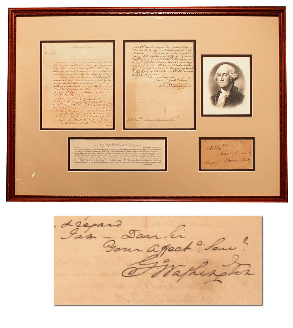 George Washington autograph letter signed as President, dated 3 October 1792 from Mount Vernon. Letter, addressed to the Hon. James Mercer, reads in full, ''Dear Sir, It has long been in my mind to ask you, though I have never yet done it, if you could give me any information of a conveyance of the Lotts I purchased at Colo. Mercer's sale of land in Frederick County in the year 1774. I can find no deeds for these Lotts amongst my land papers; but by referring to Letters which have passed between you & me (in a settlement of Accts with your Brother Colo. Jno. F. Mercer in August last) it would appear as if this had been done through your Agency. if so, your memory (much better I am sure than mine) may furnish you with the fact, and with the circumstances attending it - or, if it should not, and you would be so obliging when in Richmond to examine the Clerks Office of the General Court to see if any Deeds from you to me, by way of re-conveyance (for this I think was the mode suggested) are on record, it would be doing me an acceptable favor. If none is to be found there nor in the Frederick Office, I am yet without a legal title to the Land, although the purchase money has been allowed in the Settlement before alluded to, with interest thereon agreeably to the tenor of the Sale. With sincere esteem & regard I am - Dear Sir Your Affect. Servt. Go. Washington''. This letter appears in ''The Papers of George Washington,'' Vol. 11, page 188, edited by Philander Chase and others. Wood frame measures 28.75'' x 20''. Letter, measuring 7'' x 8.75'', is on three pages with first and last pages displayed. Includes franked envelope marked ''Free'' in Washington's hand, who also signs it ''President / US.'' In very good condition with toning throughout.