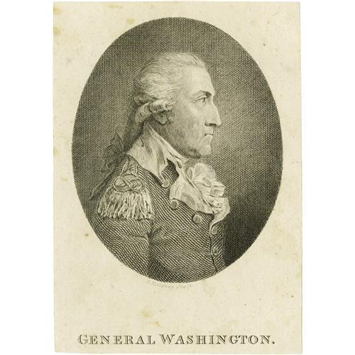 <B>George Washington: An Early Engraving of the First President In Office.</B></I> A fine small engraving after a sculpture of Washington by T. Holloway. While no engraver's name or date are present, this image is known to have been published August 1, 1792 in the <I>Literary Magazine.</B></I> However, this version with no printing on verso was not simply cut out from that publication. Listed in a larger version by Baker as No. 87. Excellent condition with just the slightest hint of light age marks. 3.3" x 4.8".<BR><BR><b>Shipping:</b> Miscellaneous Collectibles, Smal (<a target="_blank" href="http://www.heritageauctions.com/common/shipping.php">view shipping information</a>)