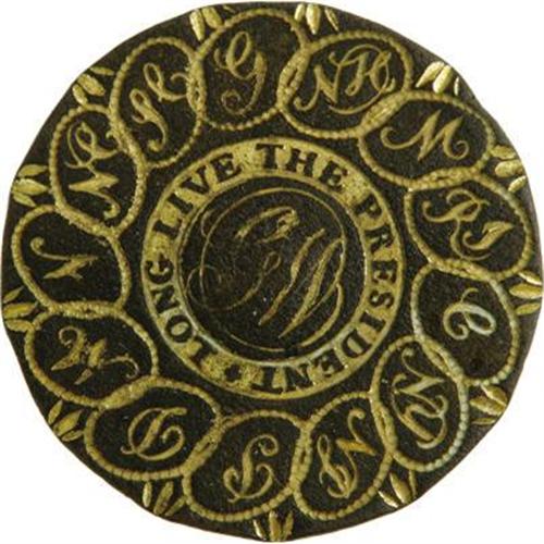 <B>George Washington: An Extremely Rare Variant of the Familiar "Linked States" 1789 Inaugural Button Variety.</B></I> It differs from the familiar version in two significant respects: around the border is an ornate decoration, consisting of three small incise lines between each link. Also, this example originally had a gilded surface. The wear on the gilding is remarkably even and visually attractive, as the photo shows. It has survived in all the recesses and is only a little gone from the "G W" script letters at center. Condition is excellent, with a very slightly granular surface to the metal on careful examination. Listed by Albert as his WI 4B. He gives it a high R-6 rarity rating, and we have never before handled an example. Given the strong demand for the Linked States variety, this specimen should excite considerable interest. Diameter 32mm.<BR><BR><b>Shipping:</b> Miscellaneous Collectibles, Smal (<a target="_blank" href="http://www.heritageauctions.com/common/shipping.php">view shipping information</a>)