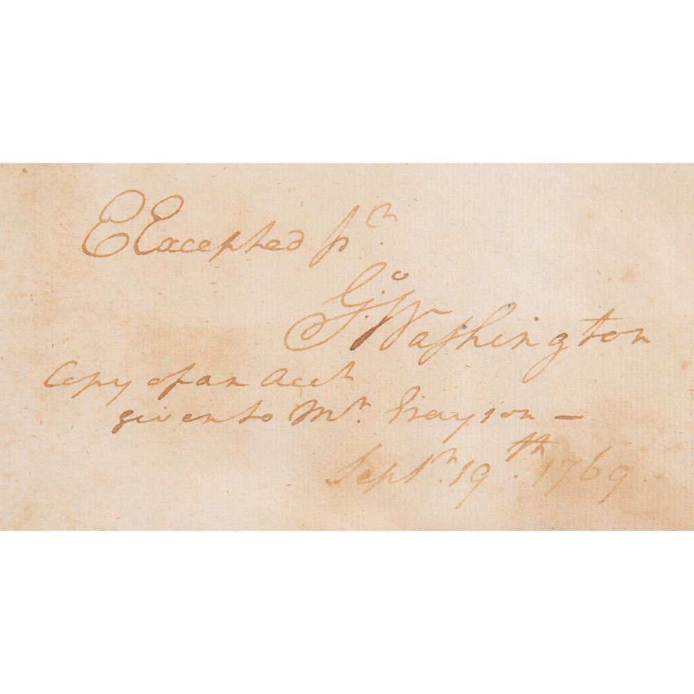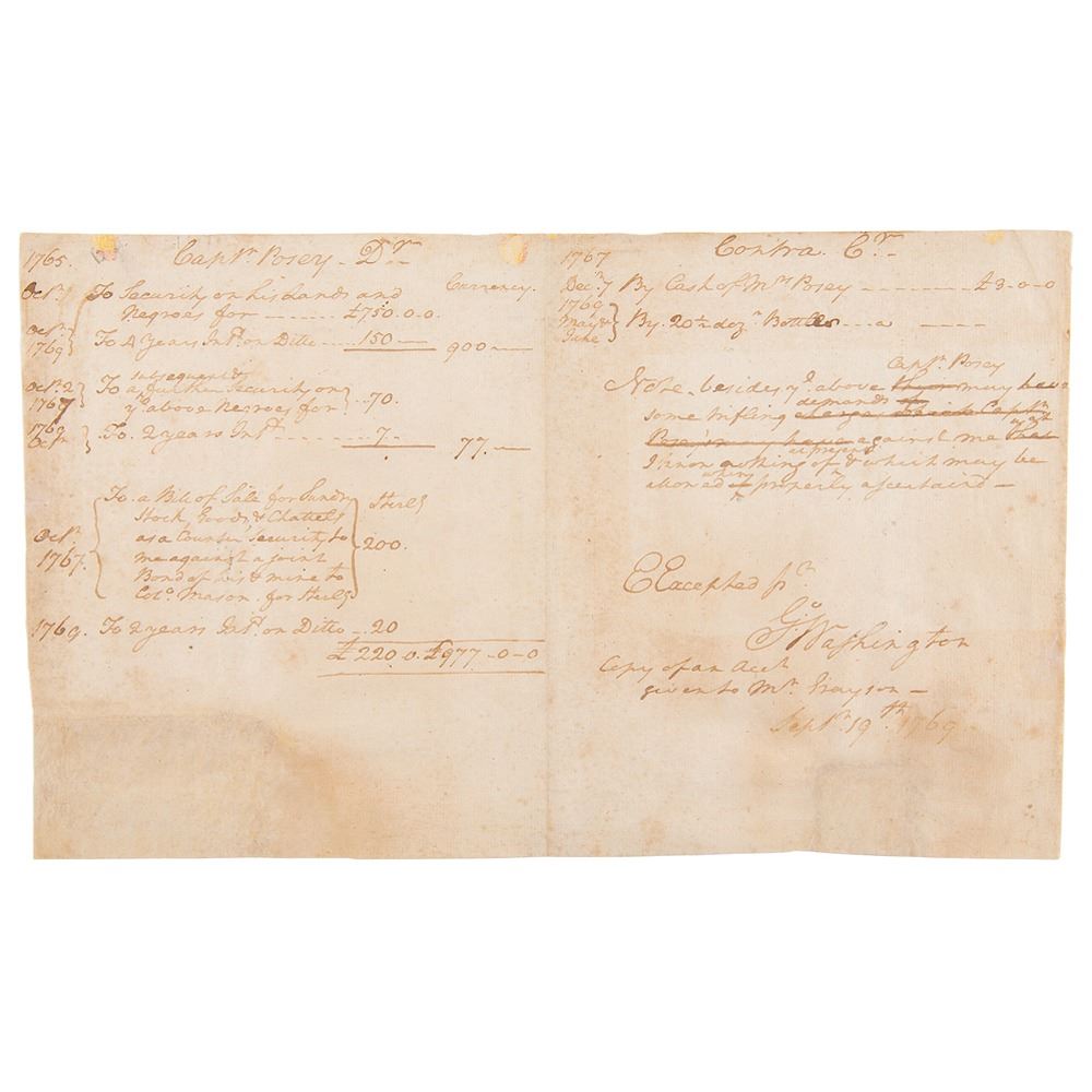 ADS, signed “Go: Washington,” two pages on two adjoining sheets, 6 x 7.5, September 19, 1769. A financial ledger document headed "Capt'n Posey," transactions made between 1765 and 1769, including "Security on his Lands and Negroes for £750," "A subsequent & further security on ye above Negroes for £70," and "a Bill of Sale for Sundry stock, goods & chattels as a…security to me against a joint bond of his & mine to Colo. Mason for £200." On the right side, a £3 cash payment is recorded, below which Washington writes: "Note, besides ye above Capt'n Posey may have some trifling demands against me that I know nothing of at present & which may be showed when properly ascertained." Washington signs at the conclusion with errors excepted, "E. Excepted pr Go: Washington, Copy of an Acc't given to Mr. Grayson, Sept'r 19th 1769." Professionally restored to near fine condition, with toning, light foxing and staining, and professional repairs to two areas of paper loss (which affect none of the handwriting).
