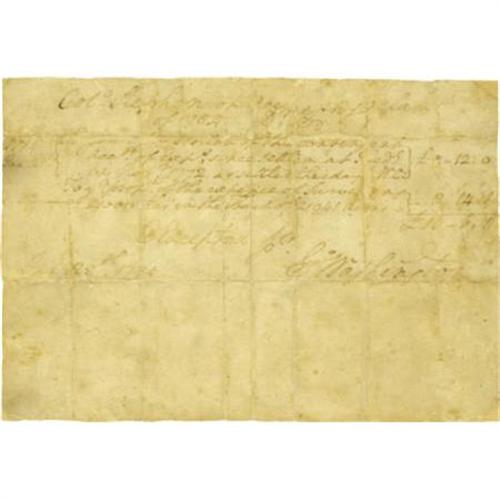 <B>George Washington Autograph Document Signed,</B></I> “<I>G Washington</B></I>”, one page, 7.25” x 5”, n.p. (likely Mt. Vernon), January 25, 1774. Written entirely in Washington's hand, this somewhat enigmatic document appears to be an invoice for expenses associated with surveying lands some twenty years earlier on behalf of a “<I>Colo. Stephen</B></I>". Old archival repairs along folds, even brown toning. With a large, bold Washington signature. Good condition. The client named on this document could very well be Adam Stephen, who served with Washington in Virginia Militia during the French and Indian War. Stephen, like Washington, was an aggressive land speculator and often was the future president's business and political rival. <BR><BR><b>Shipping:</b> Flat Material, Small (<a target="_blank" href="http://www.heritageauctions.com/common/shipping.php">view shipping information</a>)