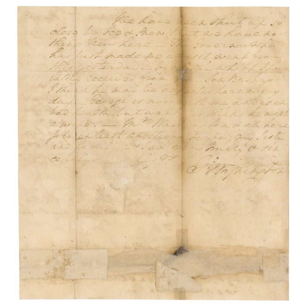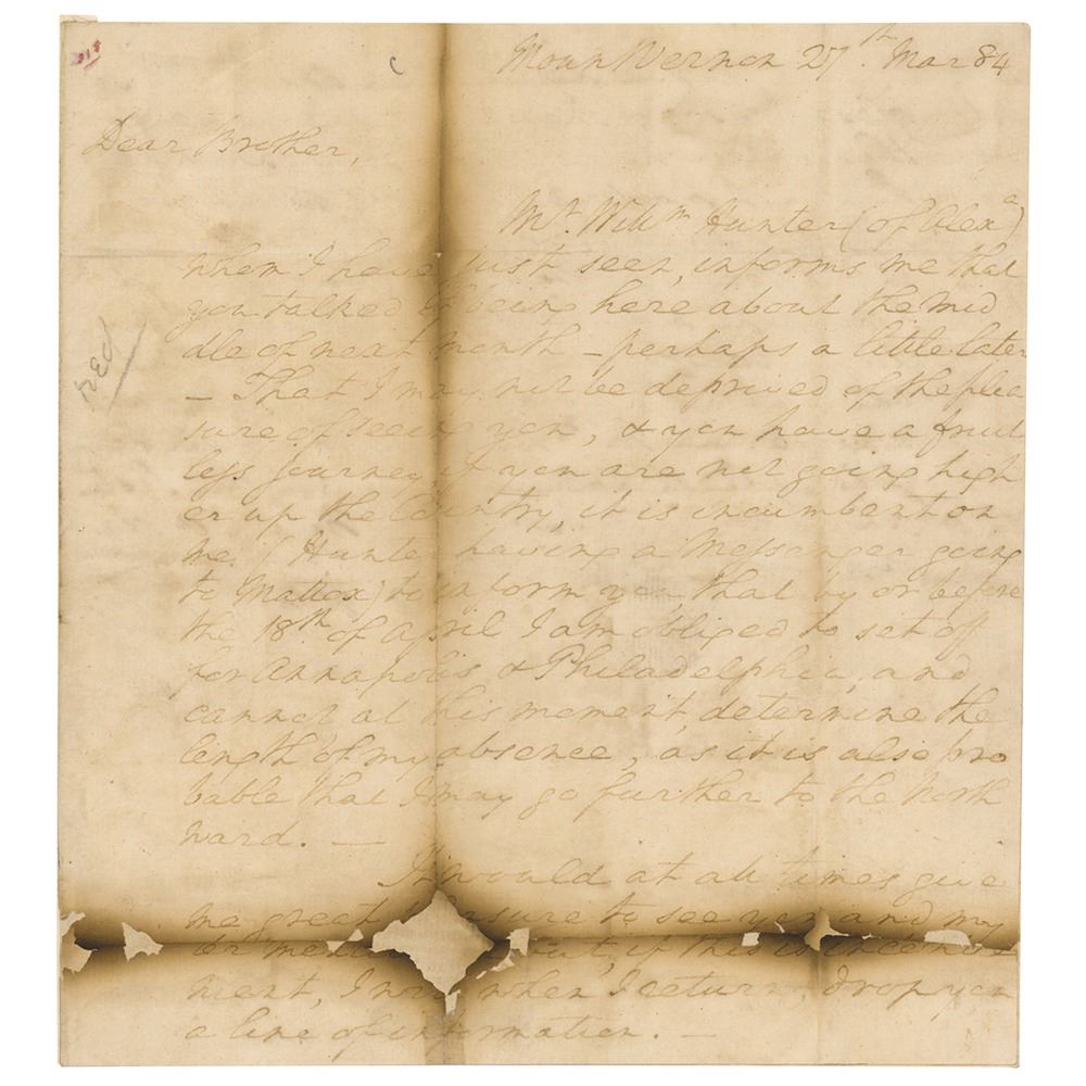 ALS signed ‰ÛÏG:o Washington,‰Û one page both sides, 7.25 x 8, March 27, 1784. Handwritten letter to his brother, John Augustine Washington, written from his Mount Vernon estate. In part: "Mr. Will'm Hunter (of Alex'a) whom I have just seen, informs me that you talked of being here about the middle of next month‰ÛÓperhaps a little later. That I may not be deprived of the pleasure of seeing you, & you have a fruitless journey, if you are not going higher up the country, it is incumbent on me (Hunter having a Messenger going to Mattox) to inform you that by or before the 18th of April I am obliged to set off for Annapolis & Philadelphia, and cannot at this moment, determine the length of my absence, as it is also probable that I may go further to the Northward. It would at all times give me great pleasure to see you‰Û_but, if this is inconvenient, I will when I return drop you a line of information. We have been shut up so close by ice & snow, that we have nothing new here. The Governor who has just made me a visit, went from this yesterday‰ÛÓby a letter which I have lately received from your son Bushrod I think he may be expected here every day‰ÛÓGeorge is now with me, and is in bad health but wants or thinks he wants a wife. Mrs. Washington & all here join in best affections to you, my Sister and family." Addressed on the integral leaf in Washington's hand, "Colo. Jno. Augt. Washington at Bushfield in Westmoreland Cty." In good to very good condition, with trimmed edges, singeing along intersecting folds affecting several words of text, areas of paper loss repaired and reinforced, and all of the handwriting light but mostly legible.