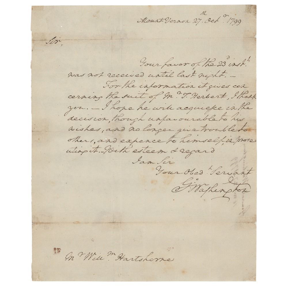 ALS signed “Go: Washington,†one page, 7.25 x 9, October 27, 1799. Handwritten letter to William Hartshorne, treasurer of the Potomac Company. From his Mount Vernon estate, Washington writes, in full: "Your favor of the 23d inst't was not received until last night. For the information it gives concerning the suit of Mr. T. Herbert, I thank you.—I hope he will acquiesce in the decision, though unfavourable to his wishes; and no longer give trouble to others, and expence to himself, in prosecuting it." In very good to fine condition, with scattered light stains, primarily to the edges from old repairs on the reverse.