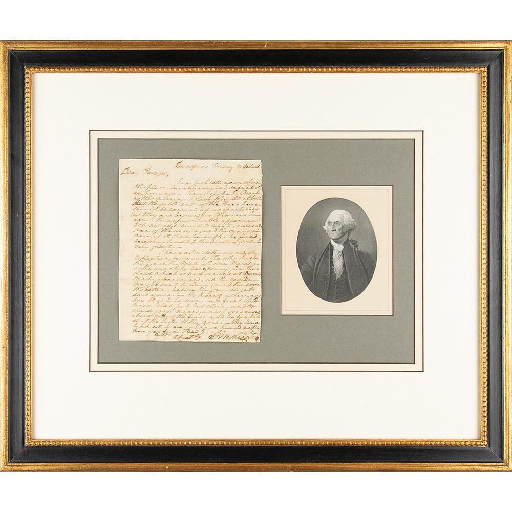 I have also determined, on reflection, to sow only Timothy Seed on the rye in the Neck. So soon therefore as the quantity necessary for that field which is now sowing at Morris’s, can be ascertained, all the residue may be sent to Davy; and the sooner the better, before the ground gets hard again. He knows where and how it is to be sown. In front of the House I shall put Red Clover and Orchard grass mixed; and if seed enough about 10 lbs of the first and half a bushel of the latter to the Acre. My love to all at home. I have heard nothing more yet from Fred'g." Handsomely mounted, matted, and framed with a portrait to an overall size of 24 x 20. In fine condition, with trimmed edges.
