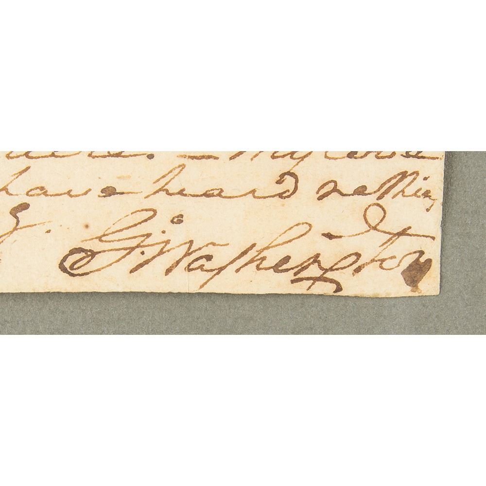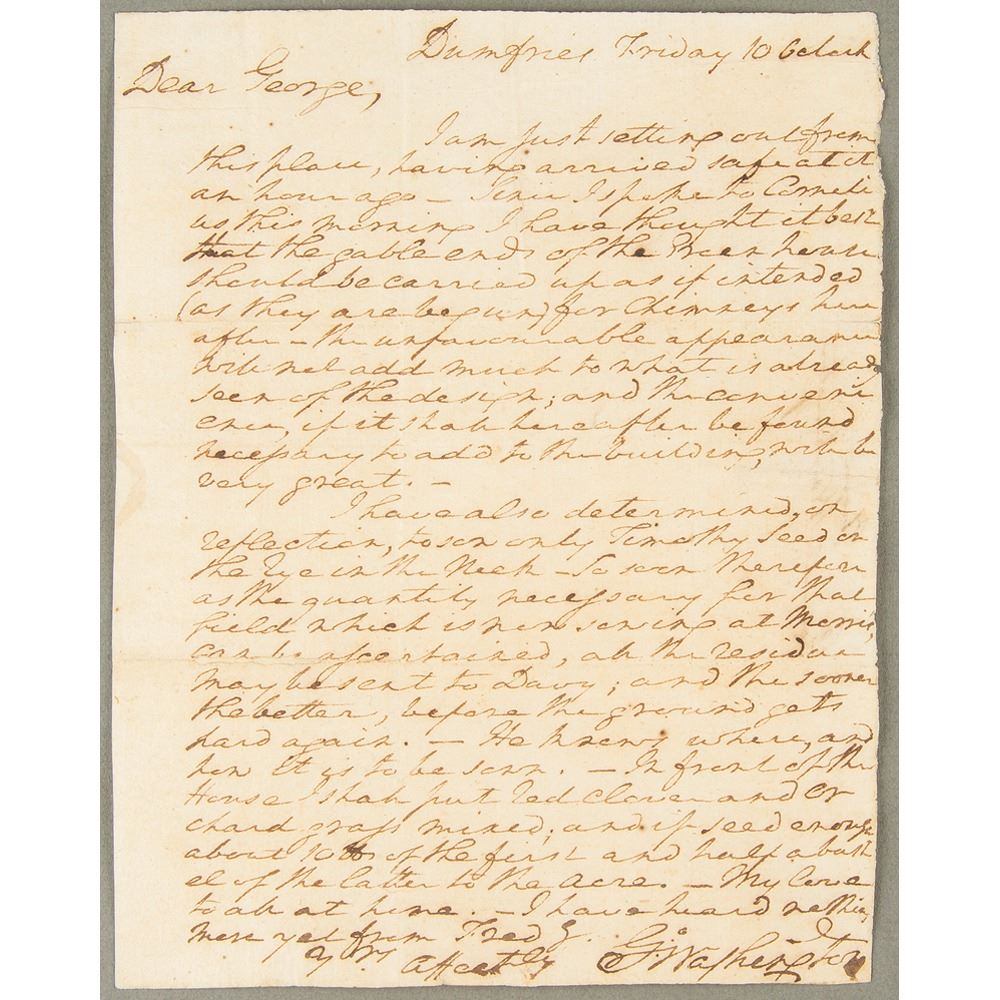 ALS as president, signed “Go: Washington,†one page, 6.75 x 8.5, April 8, 1791. Handwritten letter to his nephew George Augustine Washington, penned from Dumfries, Virginia, during his presidency. The recipient, George Augustine Washington, capably managed Mount Vernon's farms during Washington's absences in Philadelphia at the Constitutional Convention and during his presidency. Here, President Washington offers some advice on happenings on his properties, focusing on a construction project and preparations for the planting season. Most remarkably, he conveys his complete trust in one of his slaves, Davy Gray, to begin planting.