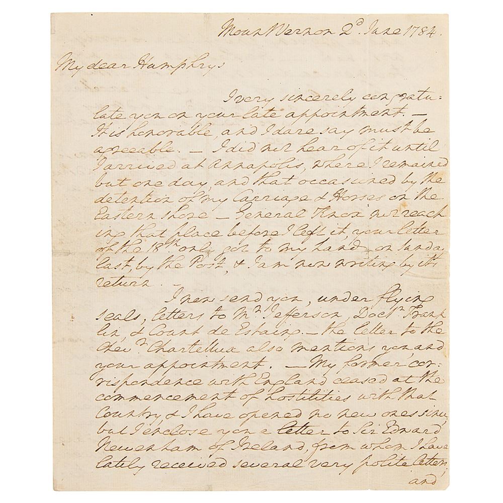 Spectacular ALS signed "Go: Washington," three pages on two adjoining sheets, 7.25 x 8.75, June 2, 1784. Handwritten letter from Mount Vernon to David Humphreys, his former aide-de-camp, who was to join John Adams, Thomas Jefferson, and Benjamin Franklin on a commission to negotiate treaties of commerce with European nations. In full: "I very sincerely congratulate you on your late appointment. It is honorable, and I dare say must be agreeable. I did not hear of it until I arrived at Annapolis, where I remained but one day, and that occasioned by the detention of my Carriage & Horses on the Eastern shore. Genl. Knox not reaching that place before I left it, your letter of the 18th, only got to my hands on Sunday last, by the Post & I am now writing by its return.