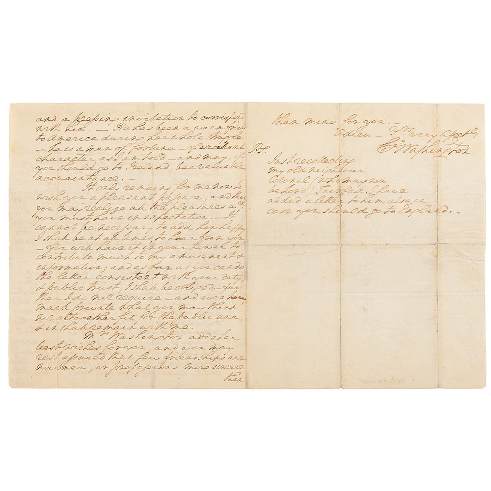Washington also adds a brief postscript which reads, "Just recollecting my old neighbour Colonel (who may now be Lord) Fairfax, I have added a letter to him also, in case you should go to England." In very good to fine condition, with professional restoration and repairs to intersecting folds, and partial separation along the fragile hinge.