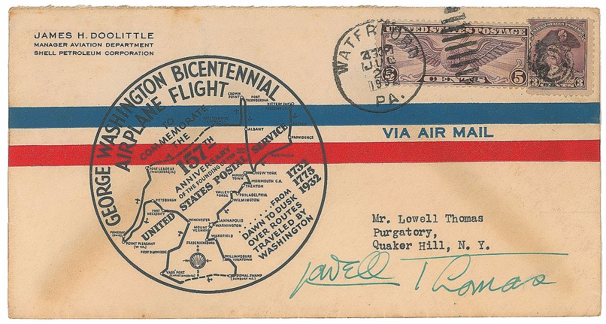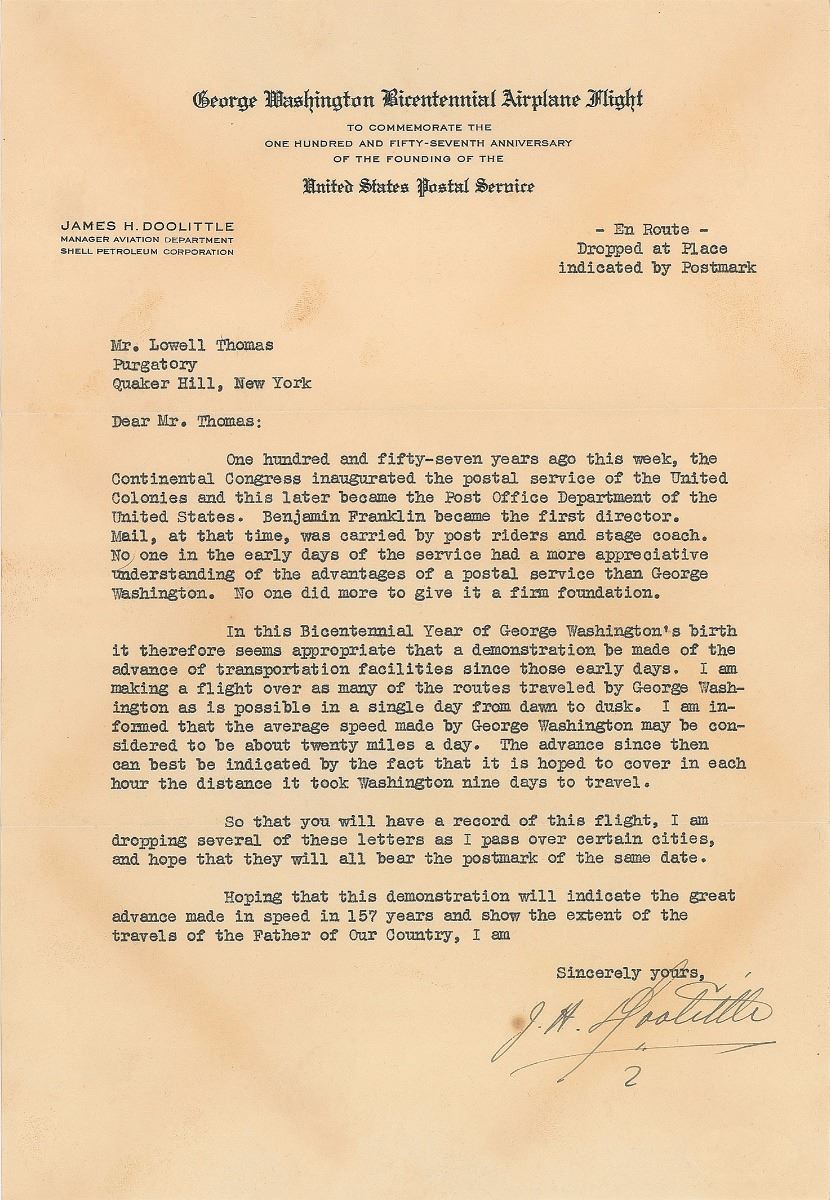 TLS by James H. Doolittle, signed “J. H. Doolittle,” one page, 7.25 x 10.5, George Washington Bicentennial Airplane Flight letterhead, July 25, 1932. Letter to noted writer and broadcaster Lowell Thomas. In part: “One hundred and fifty-seven years ago this week, the Continental Congress inaugurated the postal service…No one in the early days of the service had a more appreciative understanding of the advantages of a postal service than George Washington…In this Bicentennial Year of George Washington’s birth…I am making a flight over as many of the routes traveled by George Washington as is possible in a single day from dawn to dusk. I am informed that the average speed made by George Washington may be considered to be about twenty miles a day. The advance since then can best be indicated by the fact that it is hoped to cover in each hour the distance it took Washington nine days to travel.” Includes the original airmail cover with a cachet honoring the historic flight, signed in fountain pen by Thomas. In fine condition, with scattered toning. Accompanied by full letters of authenticity from JSA for both the letter and cover.