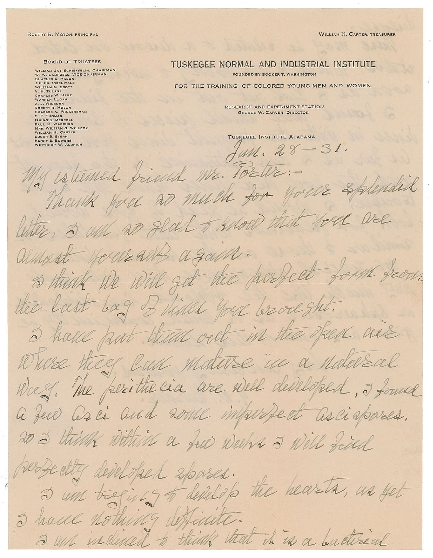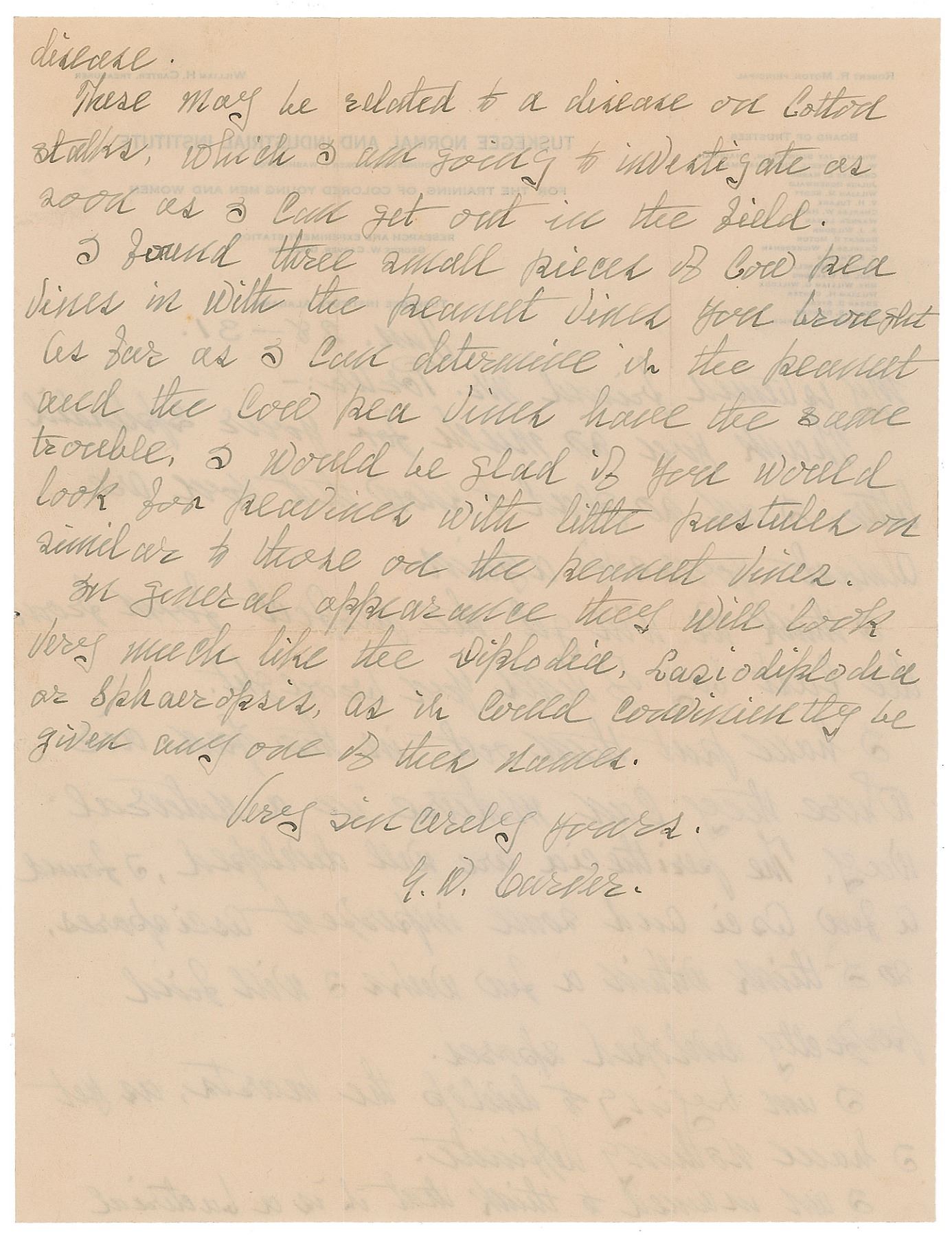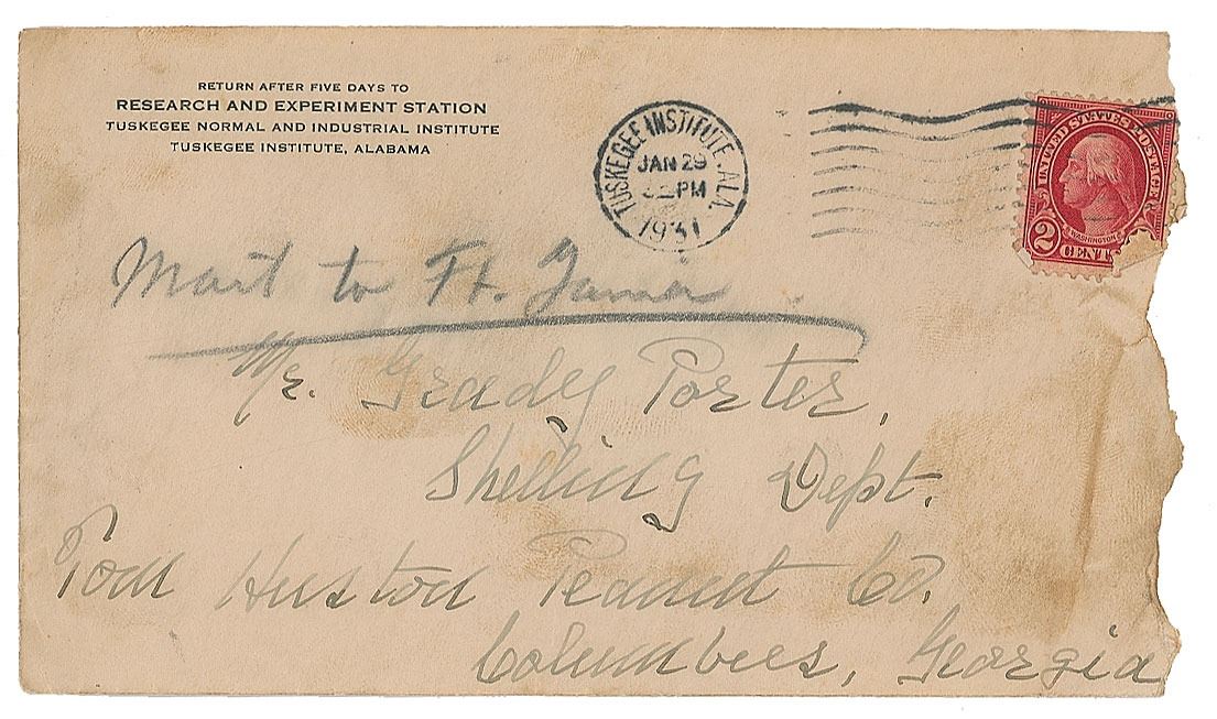 ALS signed “G. W. Carver,” one page both sides, 8.5 x 11, Tuskegee Normal and Industrial Institute letterhead, June 28, 1931. Letter to Grady Porter, a researcher at a peanut processing plant in Columbus, Georgia. In part: "I think we will get the perfect form from the last bag of vines you brought. I have put them out in the open air where they can mature in a natural way. The perithecia are well developed, I found a few asci and some imperfect asci spores. So I think within a few weeks I will find perfectly developed spores. I am trying to develop the hearts…I am inclined to think that it is a bacterial disease. These may be related to a disease on cotton starks, which I am going to investigate as soon as I can get out in the field. I found three small pieces of cow pea vines in with the peanut vines you brought…the peanut and cow pea vine have the same trouble." In fine condition. Accompanied by the original mailing envelope. By the time he wrote this letter, Carver had achieved widespread recognition for developing peanut products and bringing back the South's peanut industry after it had been devastated by insect infestation in the late 19th century.