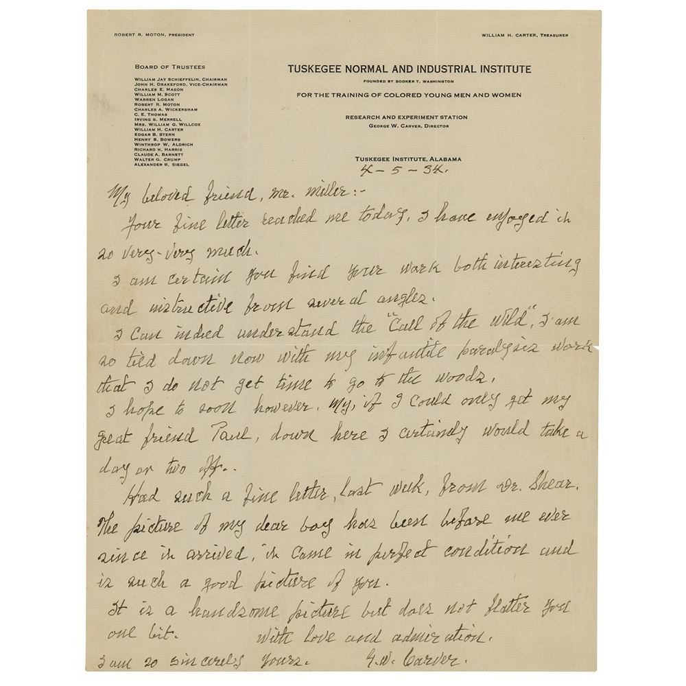 ALS signed “G. W. Carver,†one page, 8.5 x 11, Tuskegee Normal and Industrial Institute letterhead, April 5, 1934. Handwritten letter to his friend Paul R. Miller, a plant pathologist and Agricultural Research Service scientist, who made many trips to Alabama to work with Carver on peanut and cotton diseases. The letter, in full: “Your fine letter reached me today. I have enjoyed it so very, very much. I am certain you find your work both interesting and instructive from several angles. I can indeed understand the ‘Call of the Wild.’ I am so tied down now with my infantile paralysis work that I do not get time to go to the woods. I hope to soon however. My, if I could only get my great friend Paul, down here I certainly would take a day or two off. Had such a fine letter, last week, from Dr. Shear. The picture of my dear boy has been before me ever since it arrived, it came in perfect condition and is such a good picture of you. It is a handsome picture but does not flatter you one bit.†In fine condition, with some light creasing, and a short fold split, to the right edge.