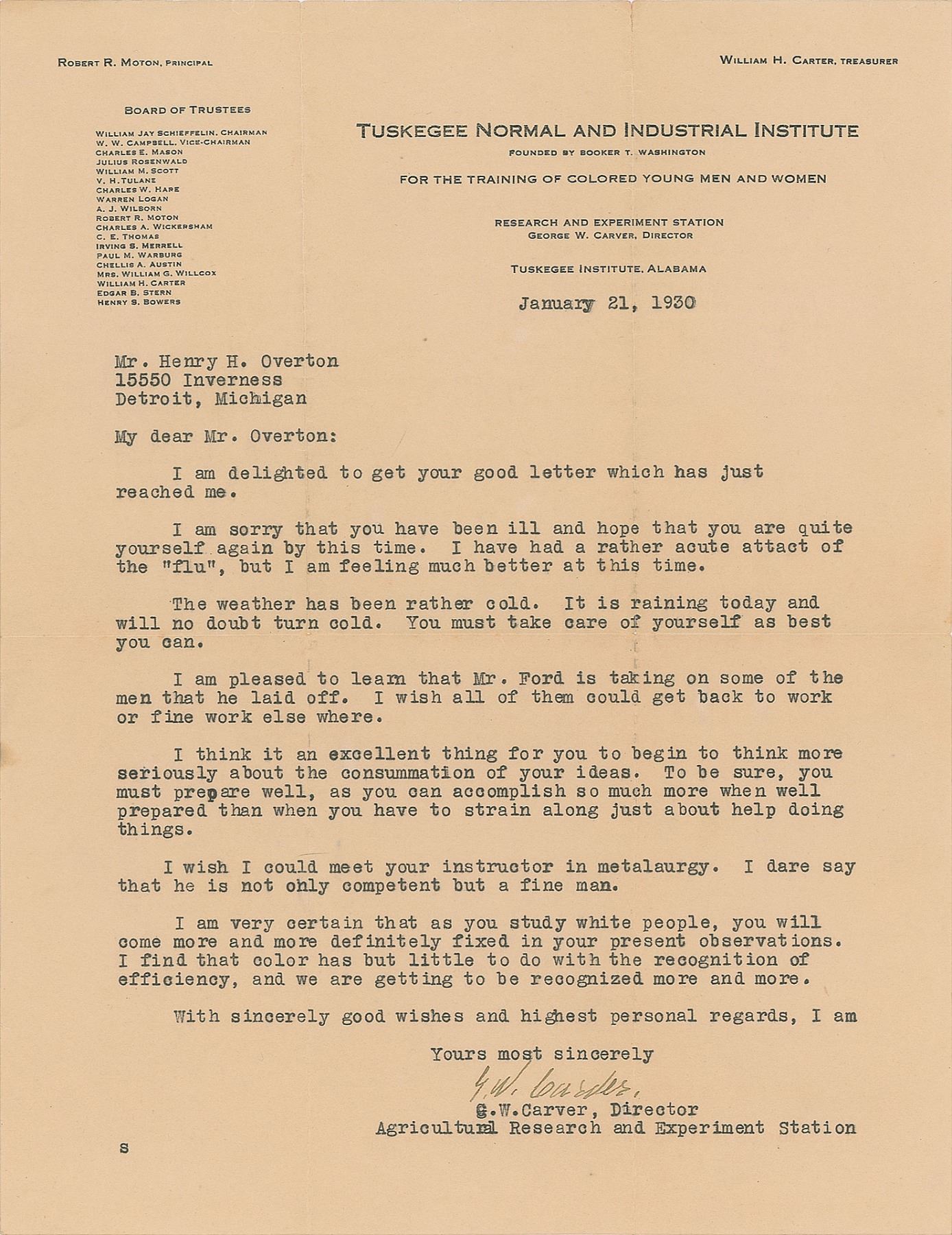 TLS signed “G. W. Carter,” one page, 8.5 x 11, Tuskegee Normal and Industrial Institute letterhead, January 21, 1930. Letter to Henry H. Overton of Detroit, Michigan, in part: "I am sorry that you have been ill and hope that you are quite yourself again by this time. I have had a rather acute attack of the 'flu,' but I am feeling much better at this time. The weather has been rather cold. It is raining today and will no doubt turn cold. You must take care of yourself as best you can. I am pleased to learn that Mr. Ford is taking on some of the men that he laid off. I wish all of them could get back to work or fin[d] work else where. I think it an excellent thing for you to begin to think more seriously about the consummation of your ideas. To be sure, you must prepare well, as you can accomplish so much more when well prepared then when you have to strain along just about help doing things. I wish I could meet your instructor in metalaurgy. I dare say that he is not only competent but a fine man. I am very certain that as you study white people, you will come more and more definitely fixed in your present observations. I find that color has but little to do with the recognition of efficiency, and we are getting to be recognized more and more." In fine condition, with short splits to the tops of the vertical folds.