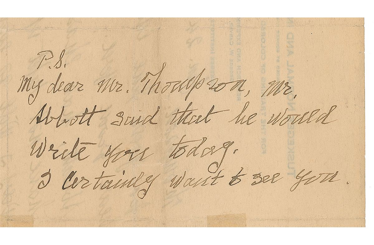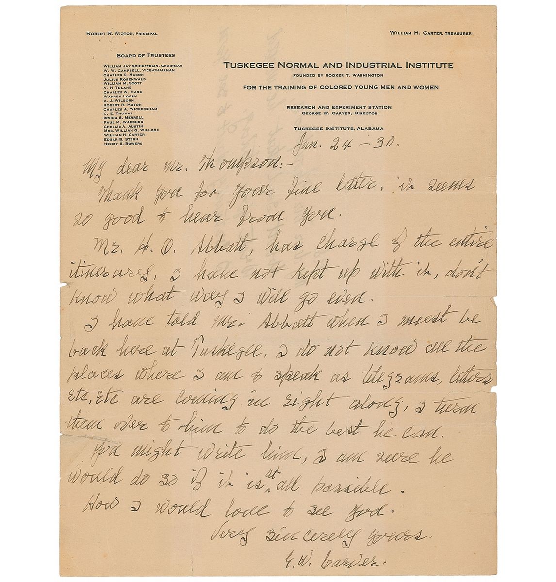 ALS signed “G. W. Carver,” one page, 8.5 x 11, Tuskegee Normal and Industrial Institute letterhead, January 24, 1930. Letter to Mr. Thompson. In part: “Mr. H. O. Abbott, has charge of the entire itineraries. I have not kept up with it, don’t know what way I will go even. I have told Mr. Abbott when I must be back here at Tuskegee, I do not know all the places where I am to speak as telegrams, letters, etc, etc are coming in right along, & turn them over to him to do the best he can.” In very good condition, with intersecting folds, one through a single letter of signature, some edge tears, staple holes to top left, and a uniform shade of toning.
