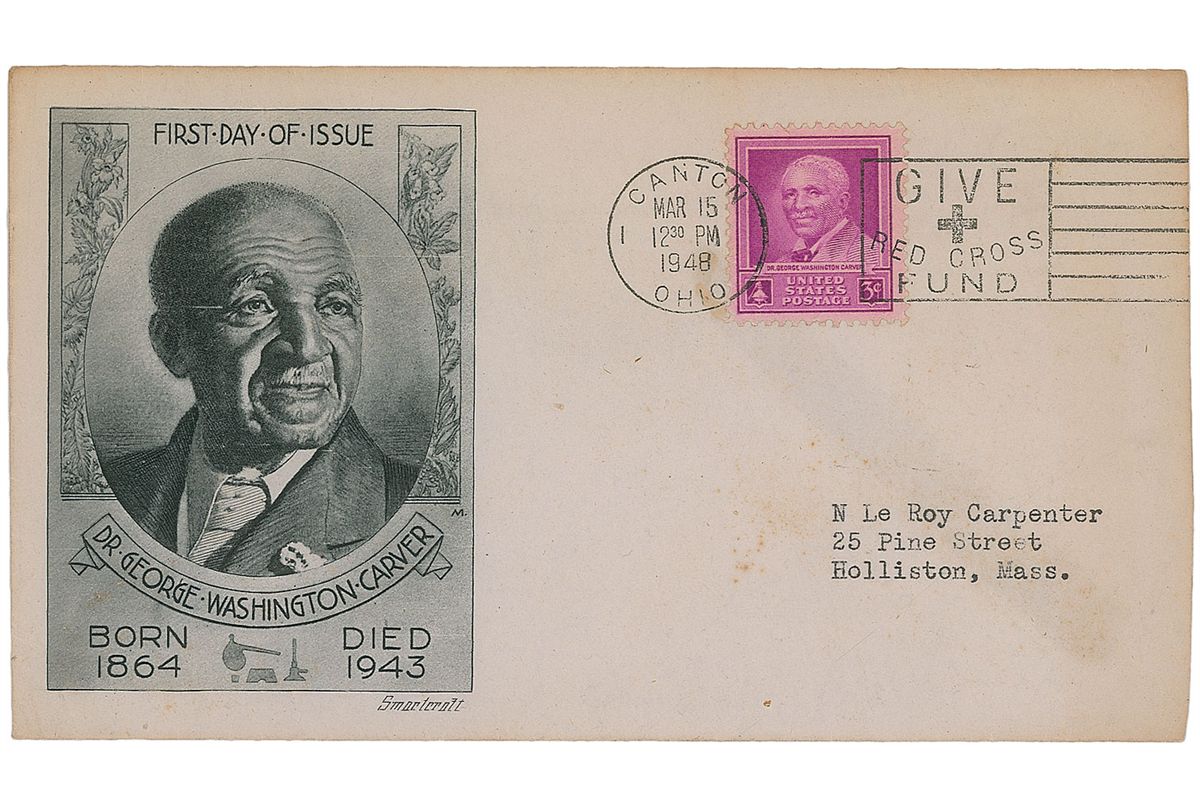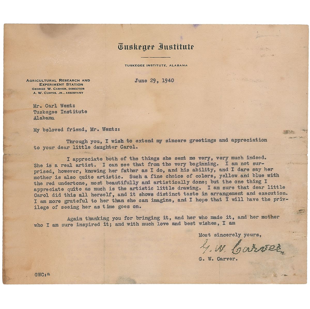 TLS signed “G. W. Carver,” one page, 8.5 x 7.25, Tuskegee Institute letterhead, June 29, 1940. Letter to Carl Wentz of the Tuskegee Institute. In part: “I wish to extend my…appreciation to your dear little daughter…I appreciate both of the things she sent…She is a real artist…Such a fine choice of colors, yellow and blue with the red undertone, most beautifully and artistically done.” In very good condition, with intersecting folds (one vertical fold passing through a single letter of the signature) and significant scattered staining. Accompanied by an unsigned FDC honoring Carver.